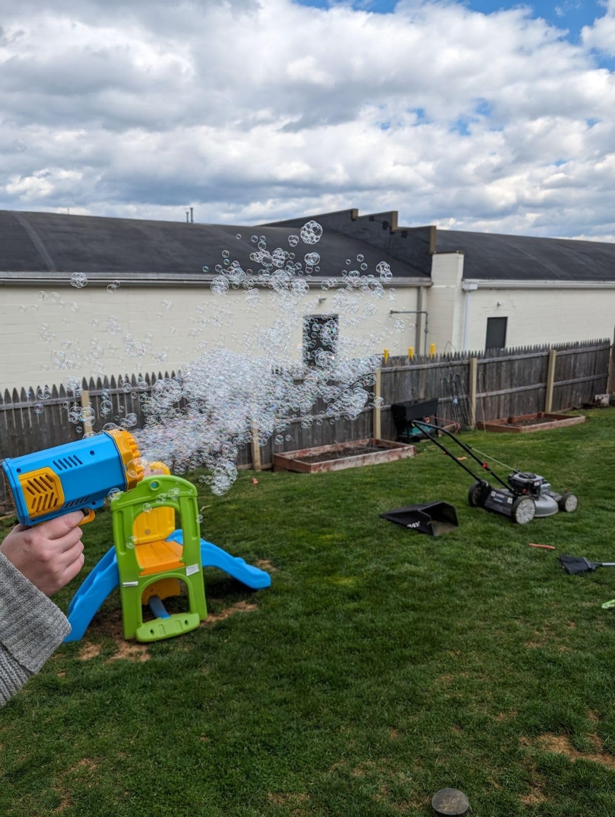 Promising review: "I recently bought the bubble lawn mower for my 2-year-old, and it has quickly become one of his favorite toys! Right from the moment we unboxed it, he was excited. The bright colors and cheerful design immediately caught his attention. He loves to push it around the yard, and the delightful stream of bubbles it produces makes him giggle with joy! What I appreciate most is how lightweight and easy it is for him to maneuver. It’s durable enough to withstand all his energetic play, and I love that it promotes outdoor activity. Plus, the assembly was a breeze—no complicated tools needed! Overall, I couldn’t be happier with this purchase. It’s a wonderful way for my son to engage with the outdoors while honing his gross motor skills. If you’re looking for a fun and entertaining toy that brings smiles, I highly recommend this bubble lawn mower!" —Mich