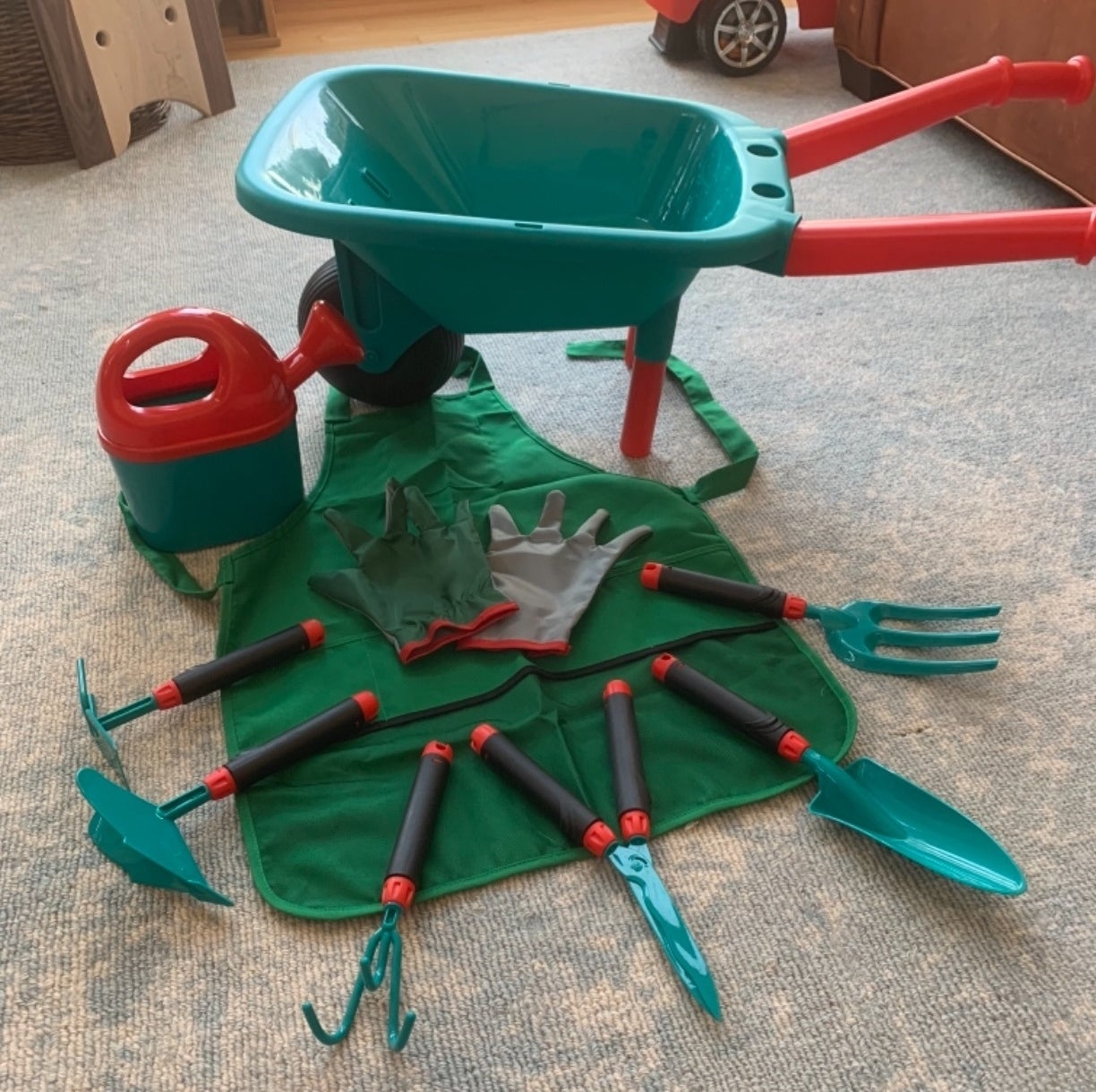 Each set includes a child-sized wheelbarrow, watering can, gloves, hand rake, shovel, double hoe, cultivator, hedge clippers, and washable apron.