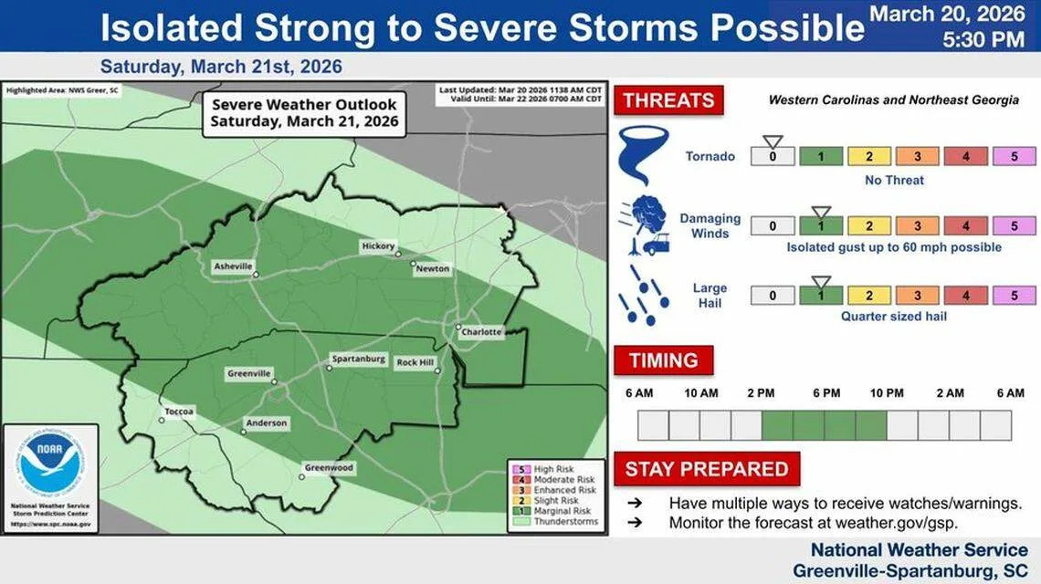At 6:50 p.m., the NWS said 50-mph winds and nickel-sized hail were possible in Anderson, Clemson and Central, S.C. until 7:30 p.m.