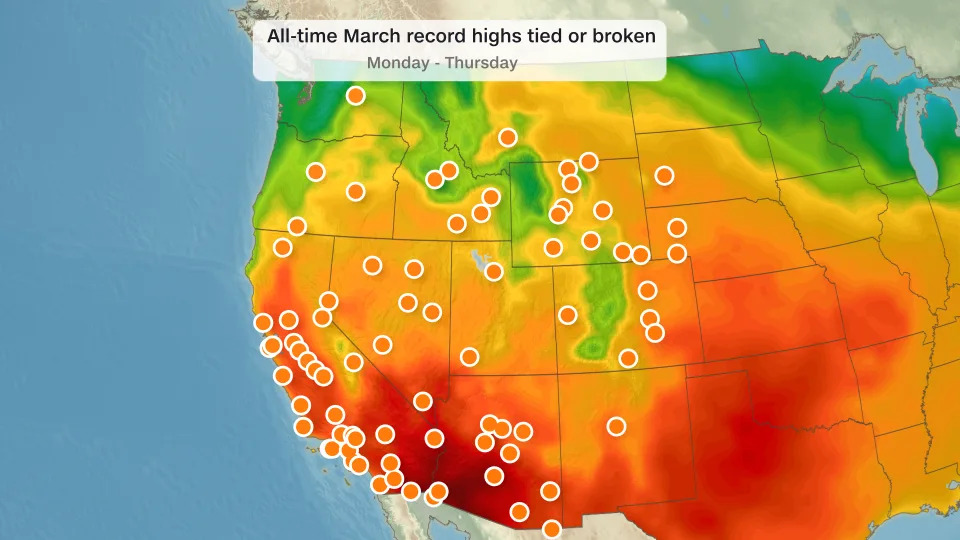 More than 100 all-time March record highs were already broken or tied this week across several states in the West and High Plains, including California, Arizona, Colorado, Idaho, South Dakota and Wyoming. And there’s more to come: The summerlike temperatures are spiking 20 to 40 degrees above average, which has even broken all-time April records.