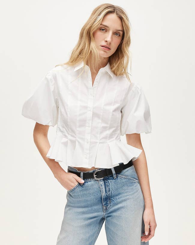 Promising review: "I recently purchased this top. I saw it in the store and had to try it on. I tried on a large and it fit perfectly. It’s sort of cropped however I can pair it with jeans." —Nae1908