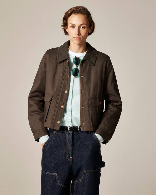 Promising review: "Gorgeous jacket. A bit roomy, but TTS. If you are a kid of the 80s--if you shopped the original Banana Republic; if you loooove the last scene in Maverick with her fabulous Porsche--this, IS you jacket. Cropped. Fabric is luxe. Truly a lifetime piece. JCrew: I'm impressed--what a great partnership! Amazing price for a collector's piece. Thinking about something else from this brand..." —TbirdThreads