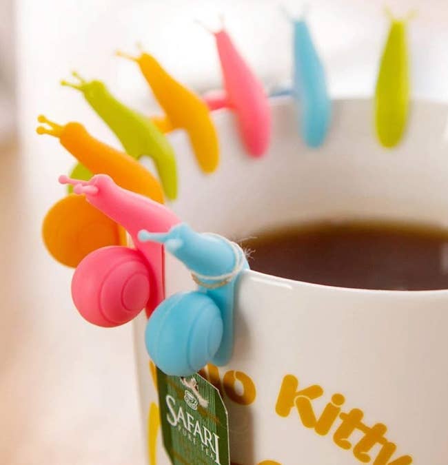 Promising review: "These little critters are awesome! I like using them on the edge of my teacup when I make hot tea. I just wrap the teabag string around the snail, and it keeps everything from falling back into my tea. I like that each one has a different color, and I keep them all handy to grab." —KA7DRE