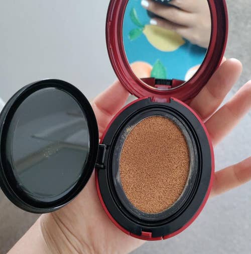 To use, apply this in thin layers to avoid creasing, then follow with your favorite concealer and setting powder if you like. If you don't like applying products with your fingers, they also make a triangle-shaped puff that's perfect for using with this.