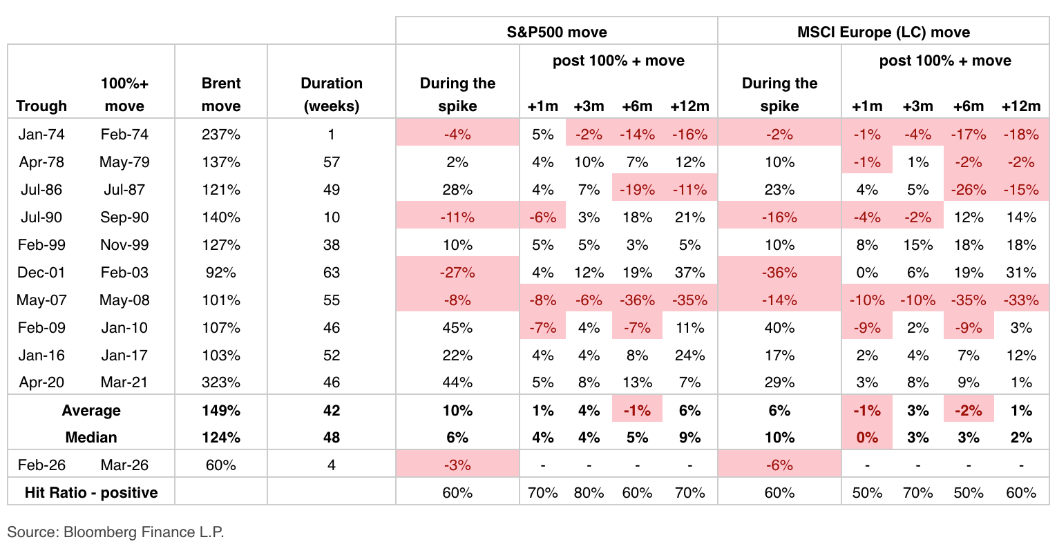 Short-term pain followed by some gain down the line β that's how history has handled significant oil price shocks, according to new data pulled from JPMorgan. Going back to 1974, in periods where oil prices have spiked more than 100%, the median performance of the S&P 500 (^GSPC) has been higher one month, three months, six months, and one year following the surge in crude (BZ=F) (chart below). The S&P 500 has a median gain of 6% during the oil price spike period. But don't get too warm and fuzzy, JPMorgan warned. "Clearly, if oil prices spike further from here β and the targeting of Gulf production capacity makes a move toward $120-$130 and potentially higher more plausible β equities would have to reprice lower," JPMorgan strategist Mislav Matejka said. The price of oil is likely to remain the main market driver in the near term. Since the launch of Operation Epic Fury on Feb. 28, global energy markets have experienced a violent "war premium" being built into prices. Oil prices, which had been around $72 per barrel before the US strikes on Iran, instantly surged. The closure of the Strait of Hormuz has placed 20% of global supply at risk. Brent crude briefly peaked at a staggering $119 per barrel in early March before settling into a volatile range. As of today, oil is trading near $113 per barrel, a nearly 60% increase in less than a month. Read more: How oil price shocks ripple through your wallet, from gas to groceries The rise in oil prices has started to hit consumers' wallets, with the average price of gas across the country approaching $4 per gallon. Diesel prices have soared, pressuring trucking operations. "[Higher gas prices are] absolutely recessionary in the short term," former Trump administration insider Gary Cohn said on Yahoo Finance's Opening Bid (video above). "There's nothing more instantaneous to a consumer than standing there holding down the gas nozzle and watching the numbers tick on the pump," he said. "And if they were paying $80 a week ago, and they're paying $85 this week, and they were paying $60 a month ago, they know that 'I lost $20 of disposable income in filling up this tank of gas.'" Cohn added, "If you're filling up four times a week, that's $80 of disposable income coming out of your pocket after tax, disposable income. That's the difference between taking your family out to dinner and not taking your family out to dinner a couple times in a week." Meanwhile, the S&P 500 (^GSPC) has faced its most significant technical breakdown since early 2025. After peaking at an all-time high of 6,797 in January, the benchmark index has notched four consecutive losing weeks, officially dipping below its 200-day moving average on March 19. Currently trading around 6,506, the S&P 500 is down roughly 6% from its record highs. The sell-off has hit market leadership areas such as the "Magnificent Seven" β for instance, shares of AI chip king Nvidia (NVDA) have slipped below the important 200-day moving average. "Understand your risk tolerance and your ability to deal with these kinds of ups and downs and curveballs, because these will always happen," Edward Jones CEO Penny Pennington said on Opening Bid. Brian Sozzi is Yahoo Finance's Executive Editor and a member of Yahoo Finance's editorial leadership team. Follow Sozzi on X @BrianSozzi, Instagram, and LinkedIn. Tips on stories? Email brian.sozzi@yahoofinance.com. Click here for in-depth analysis of the latest stock market news and events moving stock prices Read the latest financial and business news from Yahoo Finance