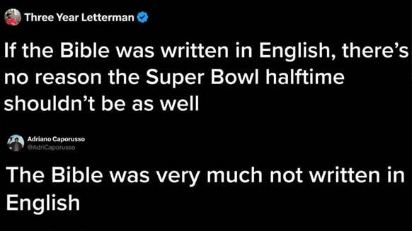 "If the halftime show wasn't 'white enough' for you, go read the Epstein files; it's all in English and full of white people." I'm a Senior Staff Writer based in New York City, where I've been covering classic BuzzFeed-style content since 2020. To another user who asked if she was serious, Ariel replied, "YES." @3YearLetterman clarified his tweet, though I don't know if he was just trolling, as some followers indicated he was "baiting": 3. America is the birthplace of the English language 4. The English language was the first written language Hence, the Bible necessarily was written in English and later translated into dead languages like Greek." @LeftyCrypto replied to Gebo with a photo of him in his profile picture, and later reposted the same tweet again (she also reposted a bunch of replies supporting her tweet). This is a reply to something Mike Johnson said irl, not online, but I'm still including it as the reply was online! Van Swol also tweeted, "Call me whatever you want… …but wanting the Super Bowl Halftime show to be in English is absolutely not racist." While it doesn't look like Chris replied to this specific tweet, he replied to another user who brought up Trump speaking at Charlie Kirk's memorial with, "And Charlie was taken out because of Politics. Did you forget that? Take a seat." He also tweeted, "To those trying to compare Trump bringing up politics at Charlie’s funeral to Biden and Obama bringing them up at Reverend Jesse Jackson’s funeral. Charlie was taken out because of politics and Jesse passed away from a battle with PSP. Let’s not compare the two. Next." It doesn't look like Lahren addressed this reply. Her tweet, referenced above, is still up. If you can't read the comments here, they say (with typos corrected): Right here is the display of the lack of intelligence in the liberal community. What I read here is a man that completely understands the complexities of sending people to Mars. Sending people to Mars is a complicated and very long journey. Through establishing a jump point on the moon, you can more efficiently send people and equipment to the Red Planet. It's logistics: less money and fuel required to send larger craft from the moon than Earth, so yes, sending and building an outpost on Mars has to include the moon. Thank you once again for reminding us how dumb you all are. Thanks for sharing your expertise! Where did you get your degree? I earned my Bachelor's in Aerospace Engineering and my Master's in Space Systems Engineering from the University of Michigan, after which I was recruited and hired by NASA's Jet Propulsion Lab to design and develop Earth-observing satellite missions. I also served as Science Investigator for a team-developed 500-page Mars Sample Return mission design (with lots of detailed calculations for EXACTLY how to get to Mars, using real math and science) in conjunction with JPL while still in college. Which Mars mission designs did you work on? You've written of being called to be a spiritual teacher, [name redacted]. It's disappointing to see someone who speaks so much of Christ's love writing with such unfounded vitriol and bitterness. Especially when you really don't know anything about the woman you're writing to. I may be a lot of things, but, being a calculus genius with some of the best education in the world, I know that unintelligent (or, as you call it, "dumb") is not one of them. Wishing you the best despite this very unfortunate comment. P.S. Sending a mission to Mars absolutely does NOT require developing an outpost on the moon. A mission to Mars and one to the moon require vastly different trajectories. I could show you if you'd like, but it would mean you'd have to brush up on your calculus. We have completed several robotic missions to Mars already, which were developed by JPL, where I was employed. If Trump is referring to manned missions including moon outposts as part of their design, as you imply (I think you are correct that that must be what he was TRYING to say), he MAY need to brush up on his communication and logic skills. Flynn Jr. replied, "You poor thing. I almost forgot how weak you beta male Hollywood actors are. Can’t even handle a meme."