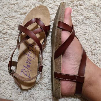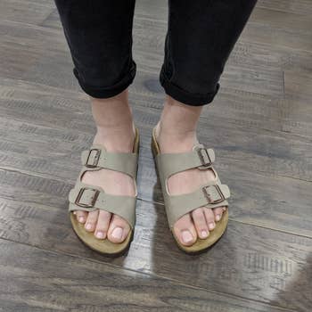 Promising review: "I’m a very hard fit in shoes. I have wide feet with a very high arch. I struggle with Plantar Fasciitis, and I’m generally cautious with what I put on my feet. I LOVE these sandals, they’re wide enough that my feet fit in the footbed and don’t hang over the side. The straps aren’t too tight, they’re very comfortable, and didn’t make my feet hurt after standing in them for over 2 hours. The elastic band that goes around your ankle wasn’t too tight, and I could slide my foot right in. That’s something I usually cannot do because of my high arch." —Heckmack