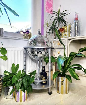 "This is the best product I've bought this year, actually! It's from a small biz based in the UK, and while it did take a while to arrive (as I expected), it was *well* worth the wait. The light bouncing off the mirror fragments and onto my walls is just dang beautiful. Between the bottom tray and the space inside the globe (yes, the globe OPENS UP!), there's a nice amount of storage for bottles and glassware. And unlike regular bar carts, the things you keep inside the globe will actually stay dust-free. I bought the 'champagne' color (which is a nice neutral cream-beige) but it comes in tons of colors that'll go perfectly with your home decor."