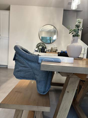 This lil' seat can be used with tables up to 3.3" thick. It's collapsible, washable, and has a storage pocket! When my son was a baby, we actually attached it to my husband's desk (we both work from home) so he had somewhere to play where we could easily keep an eye on him.