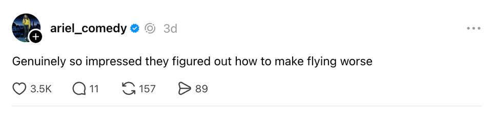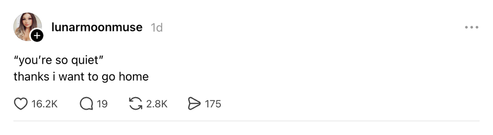 The ladies of the internet never fail to brighten our day with their brilliant and succinct wit. Each week, HuffPost Women rounds up their hilarious musings. Scroll through this week’s great tweets, threads and other posts from women, and then visit our “Funniest Tweets From Women” page for past roundups. Sign up for our Funniest Tweets of the Week newsletter here. the orchestra could overpower the conductor if they really wanted to. it’s fear that holds them back My boyfriend washed dishes and I haven’t said anything about it. He’s said “wow this kitchen looks spotless” twice since 8am if you need a boyfriend just go to the project hail mary screening and act confused i wish there was a more intense way to express my emotions than crying. i want to burst into flames I’ve just seen a woman who works at a pizza shop start a TikTok by saying “As a woman in pizza” (flirting) so what’s your favorite war I do not understand the whole face the shower vs face away debate, i'm in the shower twirling round like a fuckin kebab?? tupperware more like tupperWHERE is this fucking lid Chicken caeser…but does chicken …hear her?….does chicken understand her?….does chicken tender….? sorry i can’t hang, i need to watch my shows and then go on a walk listening to podcasts recapping my shows and then go on reddit and read about my shows. booked and busy! As a woman, it’s risky business when switching your purses. You could be leaving a whole other life in a bag & forget😭 I saw my husband at his desk with his head in his hands & I thought something was really wrong. I went over to ask him if he was OK & he said, “I’m fine. there’s just not enough time to read all the books I want to read.” (threateningly) i am going to make a spreadsheet I bet the honeymoon period of joining a cult is fucking awesome new york has the best museums!! for example right now i’m at The Duane Reade looking at a beautiful deodorant through the glass Nobody fell off harder than the hammerhead shark. Was a top shark for me as a kid and now completely obsolete in media and conversation. why is wearing a hat as someone who doesn't usually wear hats so difficult and humiliating. it feels like everyone can tell i don't know what i'm doing my toxic trait is telling my cat he is a good little boy when he has actually been committing atrocities all day every day correspondent on cnn portugal: these missiles can't reach portugal but *faint smile* they CAN reach spain pov: your boomer parents bought their house in 1980 pic.twitter.com/3UAKnHzVpW FACT: Kermit the Frog and Henry the Eighth have the same middle name. a year ago when my package was not only eaten but the delivery driver prolly watched it get eaten and jus reported it instead of intervening pic.twitter.com/ws5zCpg0Oa "I live in your head rent free" In my head housing is not a market commodity, but a guaranteed human right. In my head, I see a better world sorry. mom, dad, this is the guy i exchange reels with Sarah Michelle Gellar. What a load-bearing middle name. Sarah Gellar never could’ve been Buffy When I say Bed Bath and Beyond just know I’m talking about Bath and Body Works. It’s my dad’s time to shine https://t.co/FN4Cka3uNG my friend's mom over dinner: "you don't understand what new york was like in the '90s. jfk jr was just......around!!!!!!!! rollerblading!!!!!!!!! and if you were a pretty girl you could always tell yourself today might be the day you'd meet him and he'd ask you out !!!!!!!!!!!" locked in? no. i’m tucked in. goodnight By entering your email and clicking Sign Up, you're agreeing to let us send you customized marketing messages about us and our advertising partners. You are also agreeing to our Terms of Service and Privacy Policy.