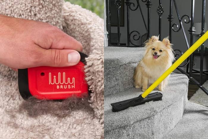 We hope you love our recommendations! While every product is independently chosen by our editors, BuzzFeed and our publishing partners may collect a share of sales or other compensation from the links on this page. You can read more about how our affiliate partnerships work in our Editorial Standards & Ethics Guide. These tools are no match for stubborn pet hair stuck on furniture, carpets or clothes. Pet owners across the internet have sworn up and down that items like the Furemover carpet rake and the Bissell Little Green carpet and upholstery cleaner have kept even the biggest hairballs (or their residue) at bay, all with surprisingly little effort — even in areas like cushion crevices, hardwood floors and rugs. I myself can attest to the strand-busting magic of the Chom Chom lint roller, which you can find in the list below, along with everything from hair-catching laundry balls to a detailer for anything that encounters your furry friend. This rubberized broom with telescoping handle captures deeply embedded hair and debris from carpets and hardwood floors so well that many reviewers were shocked at how much their vacuums were leaving behind. It also features a built-in squeegee that's great for cleaning shower walls, windows and tile. Promising review: "Picks up damn near everything on almost any surface and pulls more hair and fuzz off carpets than ANY vacuum. Nothing sticks and no fuzzy broom bottoms. The squeegee blade on the back side opens up all kinds of uses in large cleaning situations and cleanups. Cleaning it off is as simple as rinsing it off. We use it on hardwood, carpets/rugs, tile and even the dog beds." —Dannielle Price Get it from Amazon for $18.99 (also available in four other styles). The internet-famous Chom Chom, which has even made it into my own arsenal of favorite pet hair busters, uses a roller that features both a microfiber surface and a rubberized blade to attract and capture hair in the convenient receptacle. You just run it across furniture like you would a regular lint roller, then empty the bin once it's full. Promising review: "I do not leave many reviews, because honestly who has time for that lol. That being said, this is the best dog hair removal product that I have ever tried and I have tried SO many. Other rollers, scrapers, vacuums and vacuum attachments... They've worked to a point but either not worked super well or been frustrating and time consuming to use. I was pretty skeptical of this but decided to try it anyway and it works like a dream. I have a shepherd mix and another short haired dog and the amount of hair that gets on our furniture shortly after cleaning it has always been so frustrating. I got this in the mail today and tried it out and I only had to roll over the sofa cushions a couple of times before this thing picked up all of the hair. I am so excited to have this as it's going to make cleaning super fast and easy. I would definitely recommend for probably any kind of pet hair." —Jenrae93 Get it from Amazon for $24.99 (available in three colors). The Bissell Pet Hair Eraser is specially designed to tackle a variety of pet messes, especially hair, using triple-level filtration to help boost suction performance. This cord-free vacuum also comes with a set of attachments like a crevice tool and a no-tangle motorized brush tool meant for removing embedded pet hair and dirt. Promising review: "I have a Lab Retriever that sheds a lot. This vacuum has been a great tool for the house. I used to drag the big vacuum up and down the stairs. Having this vacuum has been a great time saver and not having to drag the big vacuum out every time I need to get up a small amount of something has been so great. If you have steps in your home that you have carpet on or step runners this is the tool you need. The vacuum has great suction power and with the power brush the pet hair comes right up. Also great on the furniture." —VA Removing pet hair from clothes is a notoriously difficult task, and these reusable, static-reducing and all-natural wool dryer balls are meant to attract fur from clothes while also helping to speed up drying time. They claim to work on all kinds of fabrics including linen and cotton and won't irritate sensitive skin, unlike some fragranced dryer sheets. Promising review: "I have three Persians cats. Everything in my life is covered in cat hair!!! I wear a lot of gray and blacks or I did before the cats!! These balls are amazing..I could not believe my black pants are wearable again. I would recommend this product." —Charee Lorraine Lord This detailing tool is made with a flexible, grippy-textured blade that gathers hair as it's scraped along surfaces — especially the stubborn hair that clings to cushion seams and couch crevices. Promising review: "This is my dog’s favorite item I’ve ever ordered off of Amazon. She loves it because she’s now allowed back onto the couches. She had been banned from them because she sheds so much and the hair was impossible to get out of the cushions. I spent HOURS with the vacuum trying to get the hair out, with marginal success. This product had the entire couch done in 5 minutes and with amazing results!!! The tool is sturdy enough to get the job done but doesn’t harm the fabric. Don’t wait to buy this, you won’t regret it!" —pearotthd Made from 90% post-consumer recycled materials, this hypoallergenic and uniquely textured stone picks up hair from a variety of fabrics like clothing and carpets, all with very little time and effort. Promising review: "This stone works like magic! It looks and feels like it would be hard on fabric but it was completely fine on my white woven fabric couch. It pulled all of the little dogs hairs out with ease, hair rollers and other dog hair removal devices - even professional cleaning could not get out. I’m amazed! Highly recommend it!!" —Betsy When you want something disposable, grab this classic lint roller by Scotch Brite th