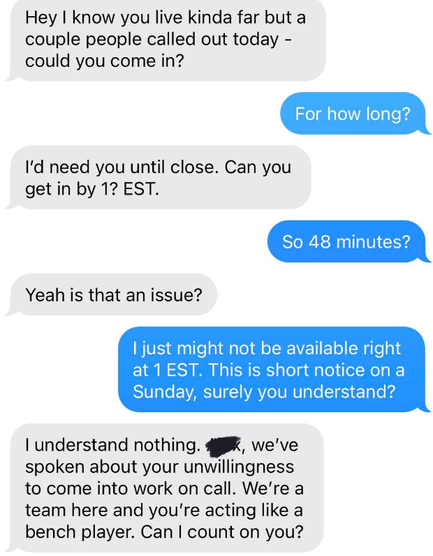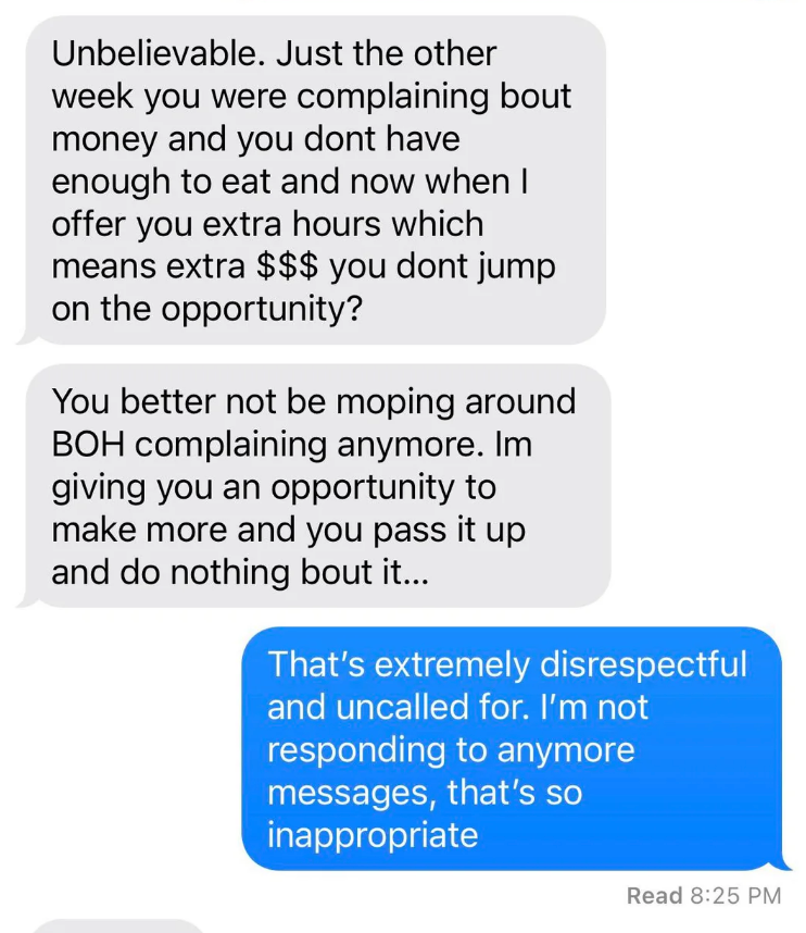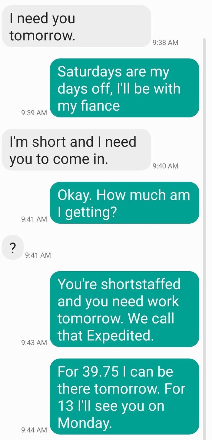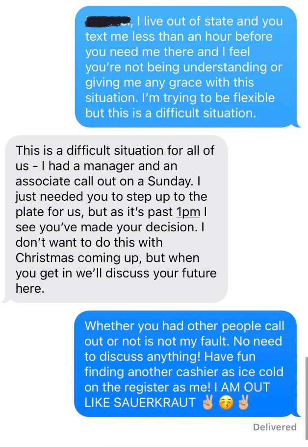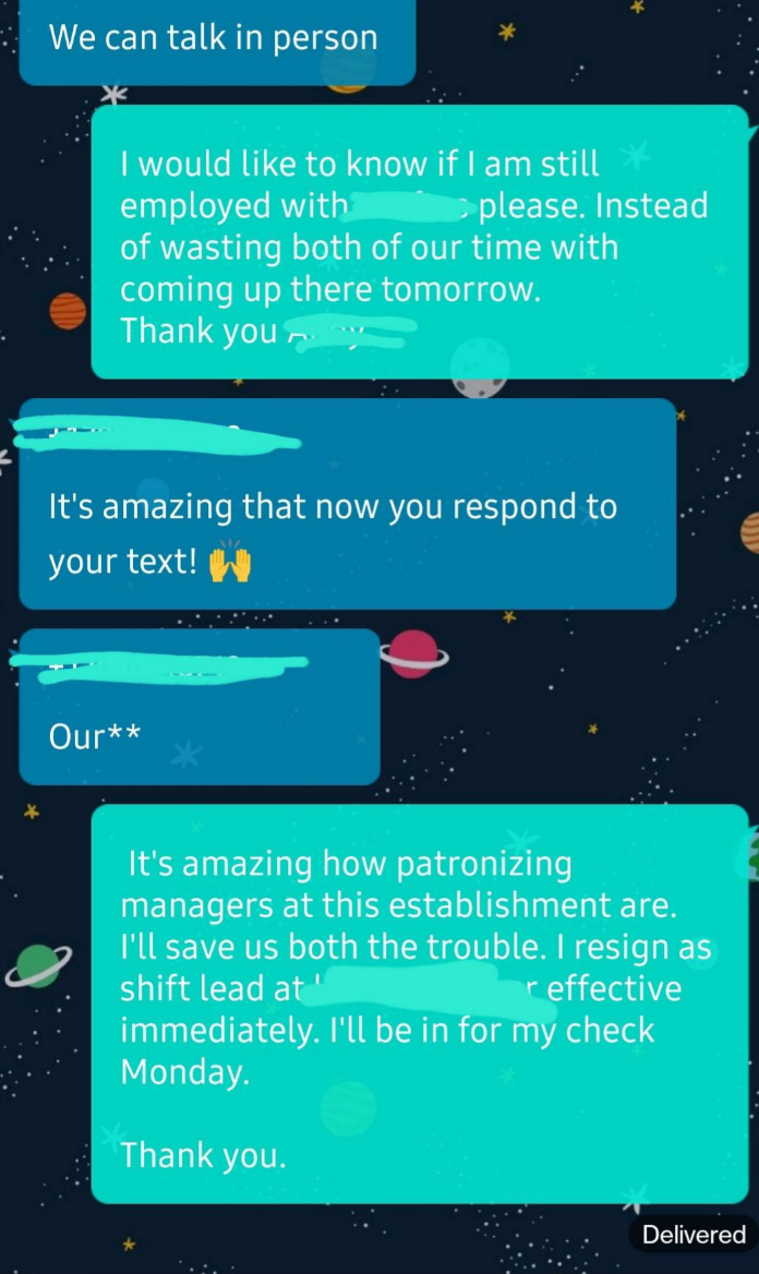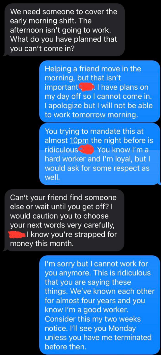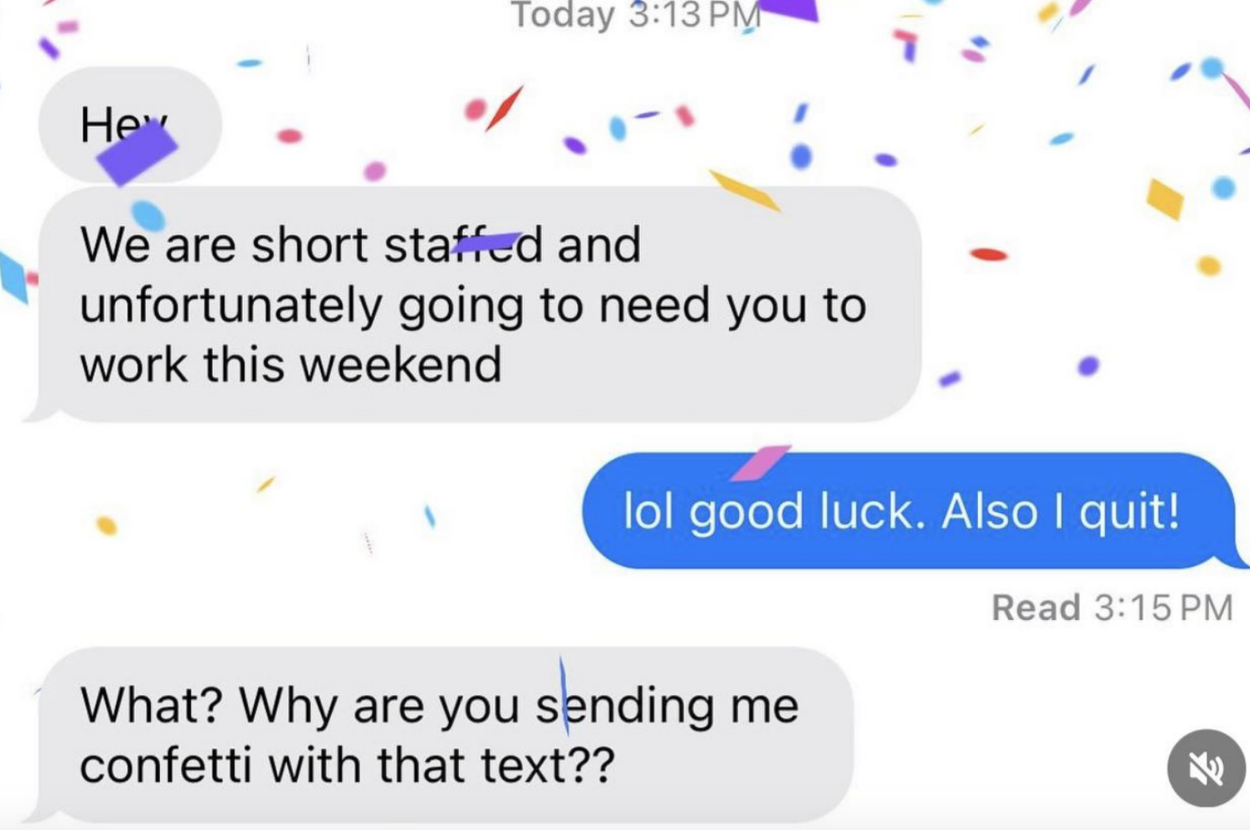 I've never seen someone write their resignation letter on a cake before. I'm a Senior Staff Writer who writes a wide range of topics, spanning from people's real-life drama to pop culture to funny things I find on the internet. Employee: "I would like to know if I am still employed with [redacted] please. Instead of wasting both of our time with coming up there tomorrow. Thank you [redacted]" Boss: "It's amazing that now you respond to your text! 🙌" Employee: "It's amazing how patronizing managers at this establishment are. I'll save us both the trouble. I resign as shift lead at [redacted] effective immediately. I'll be in for my check Monday. Thank you." Employee: "Hey [redacted] I'm just wondering how the clock in system works. I've notice on my paycheck it is always rounded to 15 minutes. I clocked in at 4:01 today and I'm just wondering if that gets rounded to 4:15 or 4:00? Thanks!" Employee: "Okay that makes sense. I've been clocking out when I'm done instead of intervals so I just wondering about that." Employee: "So If I clock out at 10:40 does that get rounded up to 10:45 or 10:30?" Employee: "Also is it possible to get a record of my time sheet?" Boss: "I never done that before. I will ask [redacted]" Boss: "Np. But nothing shady is happening. It works that way everywhere" Employee: "I'm sorry I didn't mean to imply anything shady was happening. I was just wondering if I need to wait for a 15-minute interval to clock out. And I just want to know for next time, that if I clocked in at 4:01 and clocked out at 10:44. Would that mean I lose out on 28 minutes of pay?" Boss: Yes or it will round down when you punch out" "$14.00 is not enough to essentially manage a store. I (we) are not managers. We do not need to be available 24/7. We are not paid enough to afford rent. — staff" Boss: "[redacted], I’m going to need you to come in tomorrow. Anytime between 7–8am to start. Tks." Employee: "Hey [redacted] I’m actually visiting with my family for the holiday so I won’t be able to" Boss: "[redacted] and [redacted] are both out “sick”… I know it not ideal but Im going to need you to step up to the plate for this. Tks." Employee: "I’m sorry but I’m multiple states away visiting family. I literally can’t come in tomorrow." Boss: "Unbelievable. Just the other week you were complaining bout money and you dont have enough to eat and now when I offer you extra hours which means extra $$$ you dont jump on the opportunity?" Boss: "You better not be moping around BOH complaining anymore. Im giving you an opportunity to make more and you pass it up and do nothing bout it..." Employee: "That’s extremely disrespectful and uncalled for. I’m not responding to anymore messages, that’s so inappropriate" Boss "Hey [redacted], we’re gonna need you to cover the 7am shift tomorrow as Justin called out. Be here at 6:15 for prep." Boss: "[redacted] it shows read. I’ll see you tomorrow at 6:15. Thanks again." Employee: "Hi [redacted] sorry I won’t be able to come in tomorrow. Have you asked Brian? Thanks" Boss: "Brian is married with a kid, I’m not asking him on short notice. You’re single, why can’t you come in?" Employee: "[redacted] it’s my only day off this week and I have plans. I can probably come in in the afternoon but I’ll need to get back to you on that here in a bit." Boss: "We need someone to cover the early morning shift. The afternoon isn’t going to work. What do you have planned that you can’t come in?" Employee: "Helping a friend move in the morning, but that isn’t important [redacted]. I have plans on my day off so I cannot come in. I apologize but I will not be able to work tomorrow morning." Employee: "You trying to mandate this at almost 10pm the night before is ridiculous [redacted]. You know I’m a hard worker and I’m loyal, but I would ask for some respect as well." Boss: "Can’t your friend find someone else or wait until you get off? I would caution you to choose your next words very carefully, [redacted]. I know you’re strapped for money this month." Employee: "I’m sorry but I cannot work for you anymore. This is ridiculous that you are saying these things. We’ve known each other for almost four years and you know I’m a good worker. Consider this my two weeks notice. I’ll see you Monday unless you have me terminated before then." I saw your e-mail. Don’t worry, I’m not mad. I can see why you would think I’m 'inconsistent' and 'not much of a team player.' I mean, that time I covered for your girlfriend when she had an emergency? Totally selfish of me. And let’s not forget the fact that I only called out sick two times in the past 4 years… how inconsistent of me! So yeah, I get it, I’m sorry you feel that way, but that’s life, eh? I’m sure this store will be much better off without me. Good luck with everything. P.S. I'm not coming in tomorrow because f**k you." Writing says: "I have chosen this type of paper for my resignation as a symbol of how this company has treated me. I quit: "If you read my message instead of just looking at dollar signs, you’d see I messaged you about a Sous/Exec Sous role. The job that was attached was not the correct one. That’s my mistake, but you are not qualified for a six figure Exec Chef position. Recruiter: "If you read my message instead of just looking at dollar signs, you’d see I messaged" Person: "Is this a joke or something? Does this guy actually work for you and is this how you" Recruiter's boss: "I apologize, I do see the word 'Unsubscribe' at which point, all communication should have ceased." "[Name/company redacted]’s net worth is over 400 billion dollars.Our sales plan for just today is over 100k dollars. A 24 pack of water is $4.98, without pro discounts. If [name/company redacted] is not comfortable with sparing $4.98 once every few days for its employees to hydrate, then I will be buying water with my own money and leaving it in this employee-use fri
