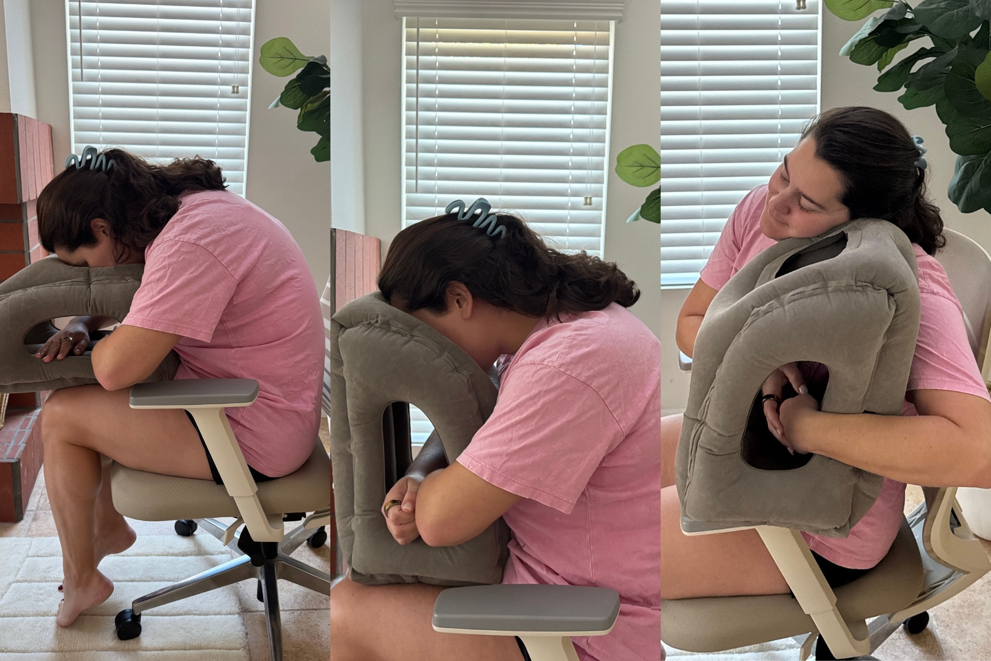 We hope you love our recommendations! While every product is independently chosen by our editors, BuzzFeed and our publishing partners may collect a share of sales or other compensation from the links on this page. You can read more about how our affiliate partnerships work in our Editorial Standards & Ethics Guide. I braved awkward stares for the best in-flight sleep of my life. The Sunany travel pillow is a lightweight, packable pillow designed for sleeping face-down on a plane tray table instead of trying to force your neck into a traditional U-shape pillow. On a recent flight to Taiwan, I was reminded of why this travel pillow is so great and a steal at just $24, too. Traditional neck pillows push your head sideways, and while they might be comfy for a short nap, they often leave your neck twisted and sore on longer journeys. You end up waking up constantly, adjusting your position, and never truly getting solid rest. This inflatable pillow changes the game by letting you lean forward and rest your face naturally, supported by your arms through the side openings. It takes the pressure off your neck, stops the head bobbing, and creates a much more comfortable way to sleep upright — perfect for those marathon flights when sleep is non-negotiable. Forward lean position (center)Instead of fully collapsing onto the tray table, you hug the pillow upright and lean your head into it. Your arms go through the side openings, which keeps your head stable and prevents that annoying forward head-bob that happens when you try to sleep sitting up. Upright chest-hug position (see top photo)In this setup, the pillow sits vertically against your chest while you lean back in your seat. You wrap your arms around it and rest your chin or cheek on the top. It’s surprisingly comfortable and gives your neck support while staying in a more typical seated position. The window lean position (my personal favorite, on the far right)If you secure a window seat, slightly deflate the pillow and wedge it between you and the plane window. It basically turns the wall of the plane into a cushioned headrest — perfect for leaning sideways without smashing your face into the plastic. When you’re ready to sleep, you take it out of your bag and blow it up — which takes about 30 seconds and 7-8 good puffs — thanks to the two valves: one for easy inflation and one for quick deflation. After inflating, just press the valve flat against the pillow so it stays out of the way. Then choose one of the four sleeping positions (or a mix) that work best for you. I’ve used it on a couple of long-haul routes in economy seats — New York to Edinburgh (seven hours) and most recently Los Angeles to Taipei (15 hours) — and both times I can honestly say I slept like a baby. This setup isn’t for everyone. Because it requires your tray table for the main sleeping position, it’s not ideal during meal service or when the tray table needs to stay up. And of course there’s the aforementioned ridiculousness of blowing it up. (My husband, for example, cringes whenever he sees me pack it because he hates watching me blow up this obnoxious travel accessory.) It’s probably best suited for travelers who don’t care about a little secondhand embarrassment — and for anyone taking long-haul flights, frequent red-eyes, or struggling to sleep with a traditional neck support. “We travel abroad several times per year. I was so tired of a sore upper back, neck, and shoulders after a long plane ride, so I tried this thing. [Oh my gosh], it was amazing. First, it deflates to a tiny box so you can easily carry on. Plus, you can use it in a variety of ways, from filling the void between you and the window, to cushioning your ribs from the hard armrest, to leaning forward on. I liked it so much I bought one for my husband and best friend, who travels with us. Side note, it folds so small that she didn’t know I had it when we went to Italy last year and I sat right in front of her. The medium is a good size if you aren’t overly tall. I’m 5’2” and my husband is 5’10” and we both felt it provided support and back pain relief. It’s also easy to sanitize. Highly recommend [making] air travel slightly less miserable.” —Amazon Customer “This pillow is a lifesaver as someone who cannot sleep on planes and often flies on red eyes. It’s easy to blow up, stays inflated for the entire flight, and is comfortable to use. The material on it is soft, but I’m confident it would be easy to clean, which is important to me as someone who thinks planes are disgusting. I love how small it shrinks down so it does not take up a lot of space in my bag. Would recommend.” —Ciara “This pillow is amazing! I fly several times a year and used to be able to sleep pretty well on planes, but in the last few years I’ve had more trouble. I’ve tried several kinds of travel pillows, but this is by far the best one I’ve ever used. Easy to inflate/deflate and can be used in multiple positions. I was able to sleep comfortably for hours with this pillow on my most recent flight.” —Courtney Reviews in this post have been edited for length and clarity.