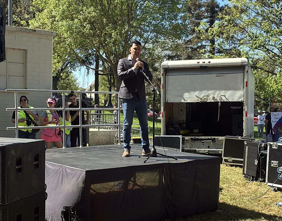Modesto’s No Kings protest started Saturday morning at Graceada Park with a few hundred people gathered around a stage listening to speakers while others checked out booths to register to vote, sign petitions and donate to local organizations. Within an hour, that number had ballooned to around 2,000 marching toward Five Points with a near-constant cacophony of supportive honks. It was part of No Kings protests nationwide against President Donald Trump’s administration and policies. In the park, some people brought their dogs and their kids and stood in the shade on the warm day. They listened to the two main speakers scheduled for the rally: Moses Abeyta, a 17-year-old Downey High School student and member of Youth Leading Modesto, and Michael Masuda, a Democratic candidate hoping to unseat Tom McClintock in the 5th Congressional District. Abeyta participated in the last No Kings protest and helped organize large student walkouts last month. “Of course, with the walkouts, there was a very, very big incentive to have a youth speaker up there,” he said. He has been among the students participating in mutual-aid events and organizing student walkouts. Masuda, who lives in Stanislaus County and is the frontrunning Democratic candidate for the congressional district long held by McClintock, did not mince words when speaking out against the incumbent. “For those of you who voiced your displeasure over email or to his office, he responded, ‘If you don’t like the law, change the law,’” Masuda said. “I say ‘F--- that, we’re going to start by changing the lawmaker.’” Some shouts of agreement were heard in the crowd along with a participant yelling, “si se puede!” John Greer was walking in the park in an inflatable pig costume with a small 3-D printed vest. His dog Luna was in a press jacket. He said he was dressed as a “fascist pig.” “It’s been like 10 to 12 years of slow -rolling destruction of our democracy,” Greer said. “I can’t even put into words how upsetting it’s been.” The crowd skewed older than the past two No Kings protests and was smaller than the previous event, which had around 2,500 participants. Signs read “Error 404: Democracy not found,” and “Believe your eyes not Trump’s lies.” Many highlighted disapproval for the ongoing war with Iran, voter suppression, ICE and the Epstein files. Water bottles, stickers and whistles, red cards and orange cards to support the constitutional rights of immigrants were handed out at the booths. Wendy Byrd, president of the Modesto/Stanislaus NAACP, was helping sign up people to become members of the local chapter and selling T-shirts to support the organization. “We were a big part of the civil rights movement,” Byrd said. “And 116 years later, we still are.” Larry Bolton, a member of the Democratic Party’s Central Committee, manned a booth for the Stanislaus County Democratic Party, registering participants to vote. “This is not what people voted for. They thought Donald Trump was going to make their lives better, make things more affordable. And does that happen? No, he hasn’t done anything,” Bolton said. Russel Miller, a 15-year-old from Modesto High School, is another member of Youth Leading Modesto, which started about a year ago. “I started this because Trump is defunding the Department of Education and I’m like ‘Hey, that affects me, I want to do something about it’,” Miller said. Miller said the group has protested gun violence and has expanded from Modesto High School to another chapter at Downey High School. The Modesto Police Department was present from the start of the protest. Officers on bikes or foot went around the park enforcing Modesto’s civil code, largely talking to people who were carrying sticks or poles with signs or flags attached. There did not appear to be any arrests or altercations with law enforcement. There weren’t any counterprotesters, which has been the case for most of the protests that have sprung up in Modesto following Trump’s second term in office. A couple of cars drove through Five Points and held signs out of their sunroofs. Just before noon, a vehicle taking a right from McHenry onto Needham street blasted “FDT,” a protest song by rappers YG and the late Nipsey Hustle. Shelly Stines, 63, has lived in Modesto her entire life. As she stood in the sun in front of the Jack in the Box at Five Points, she said it was the first time she’s been out to these events, as her health prevented her from joining in the past. “I’m sweating like a pig, I’m wearing my orthopedic flipflops, I’ve got my braces on, but you know what? I showed up.”