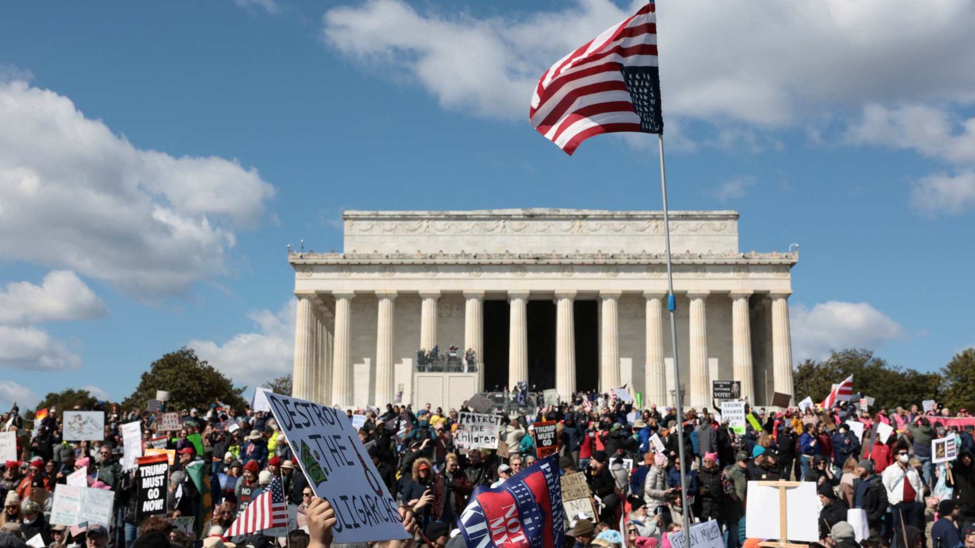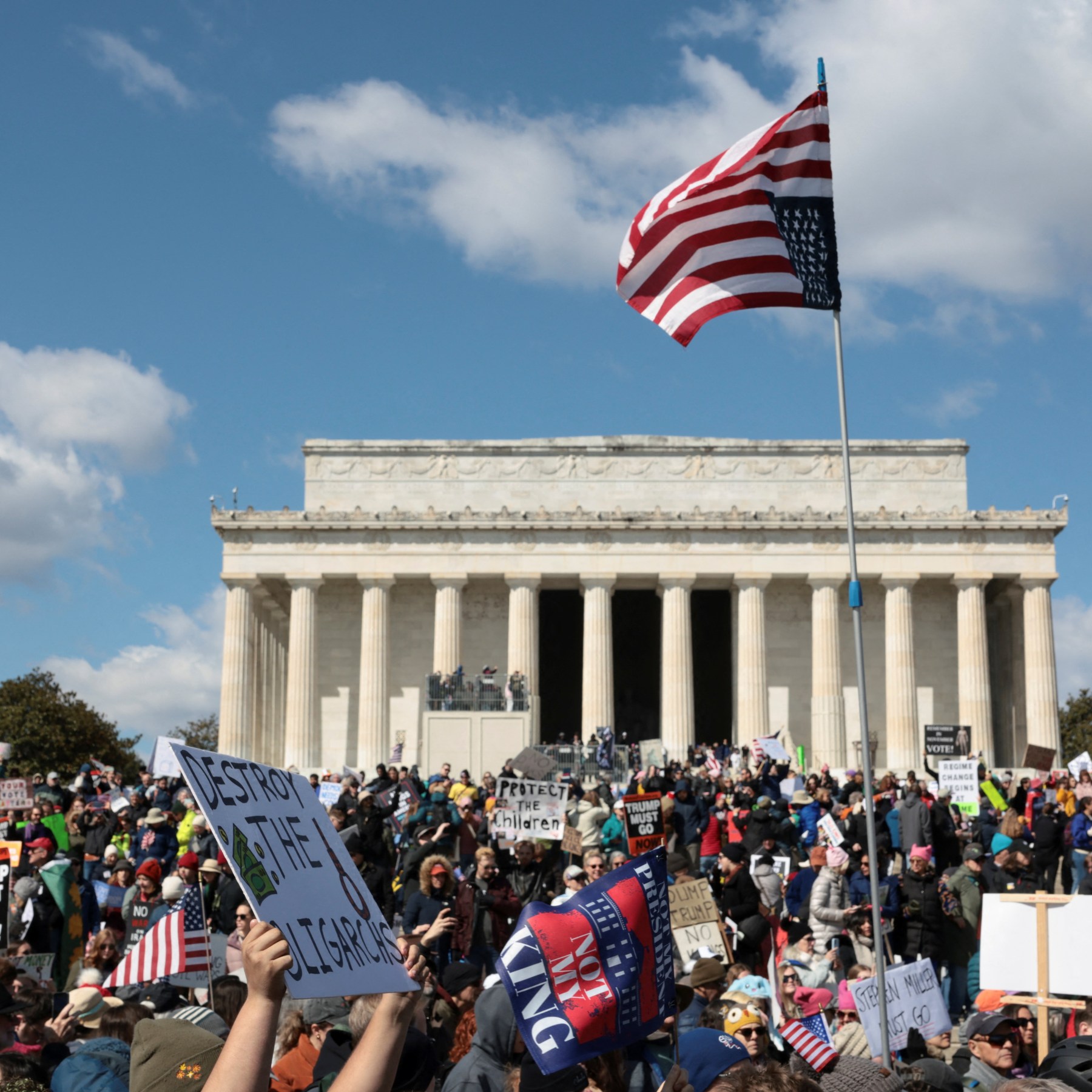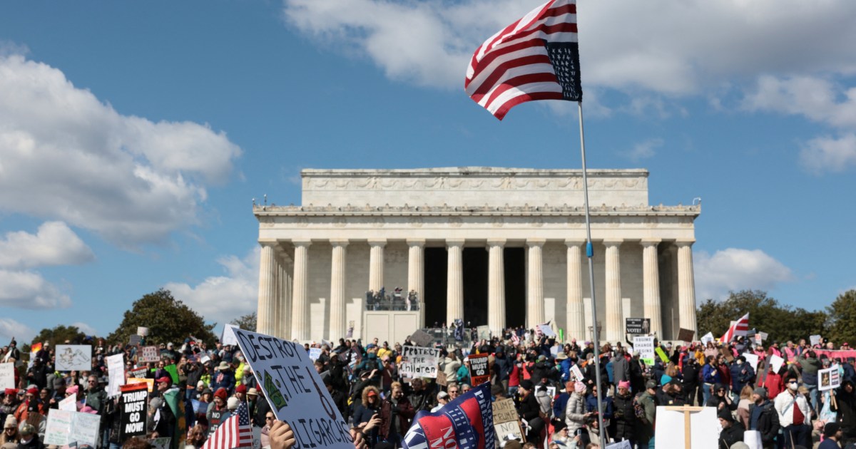 In Pictures Saturday’s rallies mark the third round of ‘No Kings’ protests since President Trump took office for a second term. Save Share Demonstrators are hitting the streets of cities across the United States for the first “No Kings” protest since the joint US and Israeli war against Iran began one month ago. Saturday’s marches and rallies mark the third round of nationwide “No Kings” protests since President Donald Trump took office for a second term. According to the “No Kings” website, more than 3,300 events are planned across all 50 states, with large crowds expected in cities such as New York, Los Angeles and Washington, DC. Parallel events are happening internationally in cities such as Rome, Paris, and Berlin. Organisers, however, are aiming to rally voters outside of the US’s major metropolises, in areas that tend to skew conservative. They say that roughly two-thirds of participants are expected to take part in events outside of major city centres. “The defining story of this Saturday’s mobilisation is not just how many people are protesting, but where they are protesting,” said Leah Greenberg, cofounder of the progressive nonprofit Indivisible, which started the “No Kings” movement last year. The main event, however, is set to take place in the Minneapolis-St Paul area of Minnesota, known as the Twin Cities. The midwestern state became a focal point for Trump’s hardline immigration crackdown in December, when he launched Operation Metro Surge. That operation saw more than 3,000 of federal immigration agents descend on the Twin Cities, where they were accused of using excessive force to conduct deportation raids. In January, agents shot and killed two US citizens, Alex Pretti and Renee Nicole Good, prompting nationwide outrage and calls for reform. Dozens of lawsuits have been filed as a result of the operation, which was wound down in February. Saturday’s protest will commemorate those deaths in Minnesota, with speeches, concerts and appearances from activists, labour leaders and politicians. Progressive Senator Bernie Sanders is expected to address attendees, and rock icon Bruce Springsteen will perform at the event, along with folk singer Joan Baez. “It is your courage and your commitment that have inspired all of us. You have shown the power of nonviolent protest,” actor Robert De Niro told the crowd in Minnesota in a pre-recorded address. “You’ve shown bravery in the face of armed attack by government thugs, and you stood together and ran them out of town.” Already, early on Saturday, marchers in Washington, DC, gathered around landmarks such as the Lincoln Memorial and the Washington Monument, holding signs and waving papier-mache effigies of the Trump administration. The previous two “No Kings” marches took place in June and October and drew millions of people. Trump responded to the October protest by posting an AI-generated video depicting himself dumping faeces on the protesters. The US is currently in the midst of campaigns for its pivotal midterm elections in November, which will see Trump’s Republican Party seek to defend its majorities in both chambers of Congress.