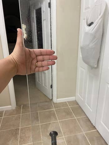 Promising review: "I thought my hard water stains would never come off my shower doors, but I bought this awesome brush set, and it's amazing! I’ve tried all the hacks — drier sheets, clean erasers, lemon, vinegar — nothing works like this brush! I used Zep shower cleaner with it! In the picture, the side on the right is the part of the door I cleaned, and I still have to clean the left side." —Traci D.