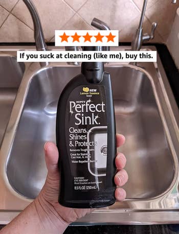 Here's what BuzzFeeder Maitland Quitmeyer has to say about it: "I bought this for my white porcelain kitchen sink and I've since texted five people about it, which is really a lot for such a boring grown-up product. It cleans beautifully, but the *best* thing about it is its ability to repel stains after cleaning. You know that thing when you rinse out your coffee cup and the coffee water just lingers in your sink, and you have to purposefully rinse it out for two minutes? You don't have to do that — the coffee can't stick to the sink and just goes RIGHT down the drain. Time saved, sink clean — this is really a Virgo dream product right here."