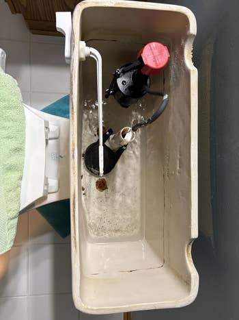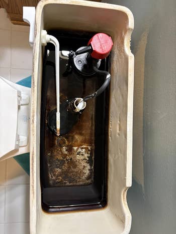 Promising review: "This product is IMMACULATE. 100/10 recommend. I only got a picture of my toilet tank about four hours into putting a third of the bottle in, and then after eight hours, but prior to using it, our toilet tank was like blood red with iron (well water) and other minerals. It’d gotten so bad that our toilet was having a hard time flushing, but not even half of the bottle and it’s pretty much ALL gone. It completely got rid of the staining, our toilet is flushing 100% easier, and I haven’t noticed as much staining. I saw some complaints about smell but honestly I had no smell complaints. I did get a long thin scrub brush just to pick up some of the stuff that settled at the bottom of the tank, but this instant power powder stuff did like 99% of the work on its own." —Soraya