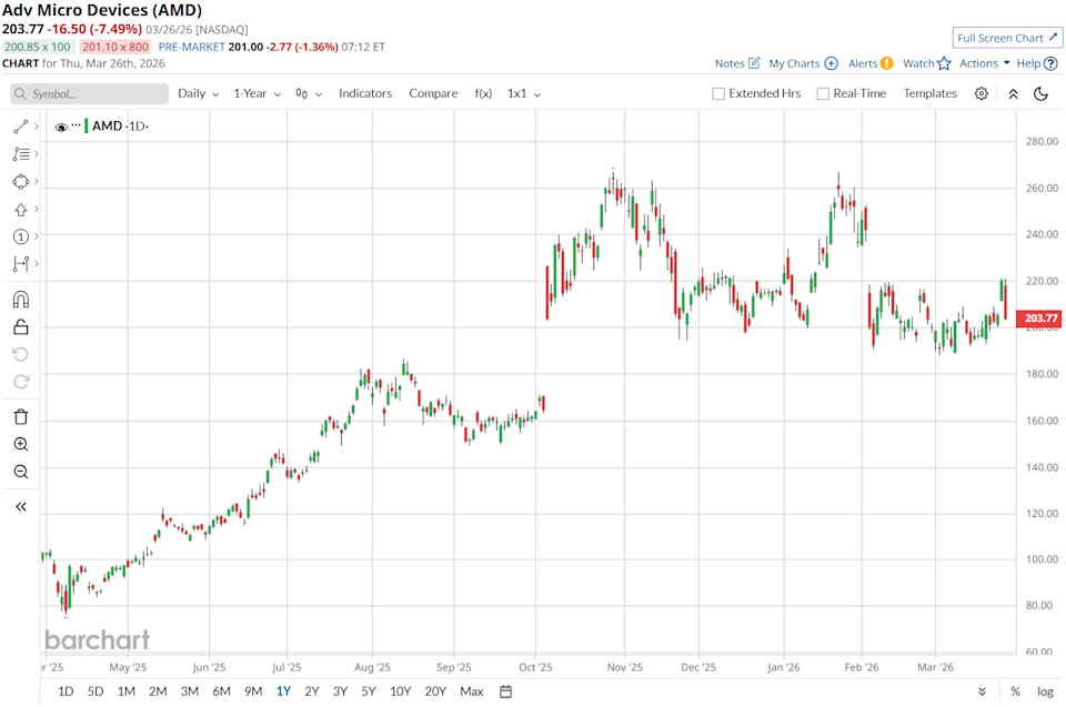 On valuation, AMD trades at a forward P/E of 39.04 times, compared with the sector median of 21.12 times. That is a clear premium, but it also shows that the market is still willing to pay more for AMD because of its stronger growth profile.The company’s recent results help explain that view. AMD posted record Q4 2025 revenue of $10.3 billion and finished full-year 2025 with a record $34.6 billion in revenue. Non-GAAP operating income for the year came in at $7.8 billion, while diluted EPS reached $4.17. For Q1 2026, AMD expects revenue of about $9.8 billion, which points to roughly 32% year-over-year (YOY) growth.AMD is also doing more to strengthen its position in AI infrastructure. The company recently announced a partnership with Celestica (CLS) to bring the "Helios" rack-scale AI platform to market, combining AMD’s next-generation Instinct MI450 Series GPUs with Celestica’s advanced networking switch technology, with availability expected in late 2026. Further, AMD signed a multi-year partnership with Nutanix (NTNX) in February 2026 and committed up to $250 million to support agentic AI workloads on AMD-powered infrastructure. Together, those moves show AMD is working to expand beyond chips and offer broader AI systems, the kind of setup large customers like Meta need to support 1GW-scale data centers.Wall Street remains positive on the stock. Out of 45 analysts surveyed, 30 rate it a “Strong Buy,” two rate it a “Moderate Buy”, and the remaining 13 are a “Hold.” The average price target of $286.37 implies about 41.8% upside from the current share price, and the Street-high price of $380 looks to an 88% climb from here.