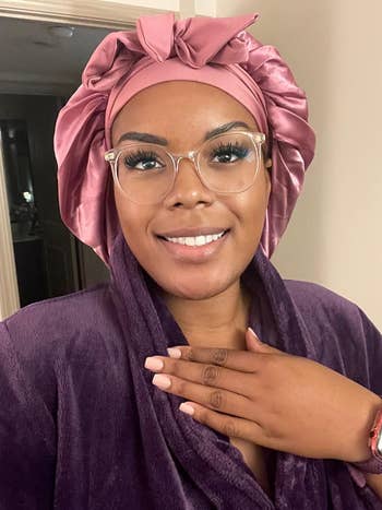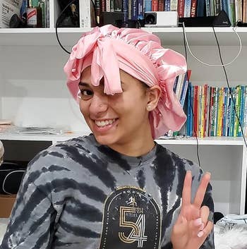 Promising review: "I have long curly hair and use bonnets at night to prevent tangling, drying, and breaking of my hair. I knew this bonnet was different as soon as I put it on. The wide, soft band was so comfortable on my head, and the long straps to tie it were incredible. I’ve had bonnets before where the elastic was just one size with no option to tie, and they were often too tight or too loose; both were awful to sleep in. I also love the size of the bonnet because I did not have to find a way to fit all of my hair in; it was roomy enough to fit with ease. The material is so silky and smooth, and it's incredibly lightweight, so it didn’t feel like it was tugging down. I was not disturbed at all in my sleep wearing this bonnet because it was so comfortable. The color is super pretty, and I will be buying more of these. They’re now my favorite!" —Emily