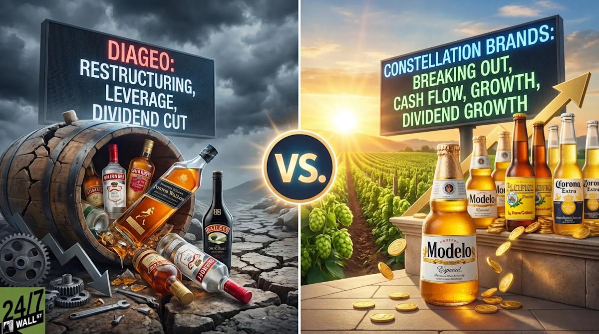 Diageo (NYSE: DEO) and Constellation Brands (NYSE: STZ) both sell alcohol, both trade at depressed prices, and both face real headwinds. For a retirement-focused investor deciding between them right now, the choice is clear. One company is in the middle of a painful restructuring with no clear end date. The other is cleaning up its portfolio and generating cash. Here's how they compare across the three dimensions that matter most.