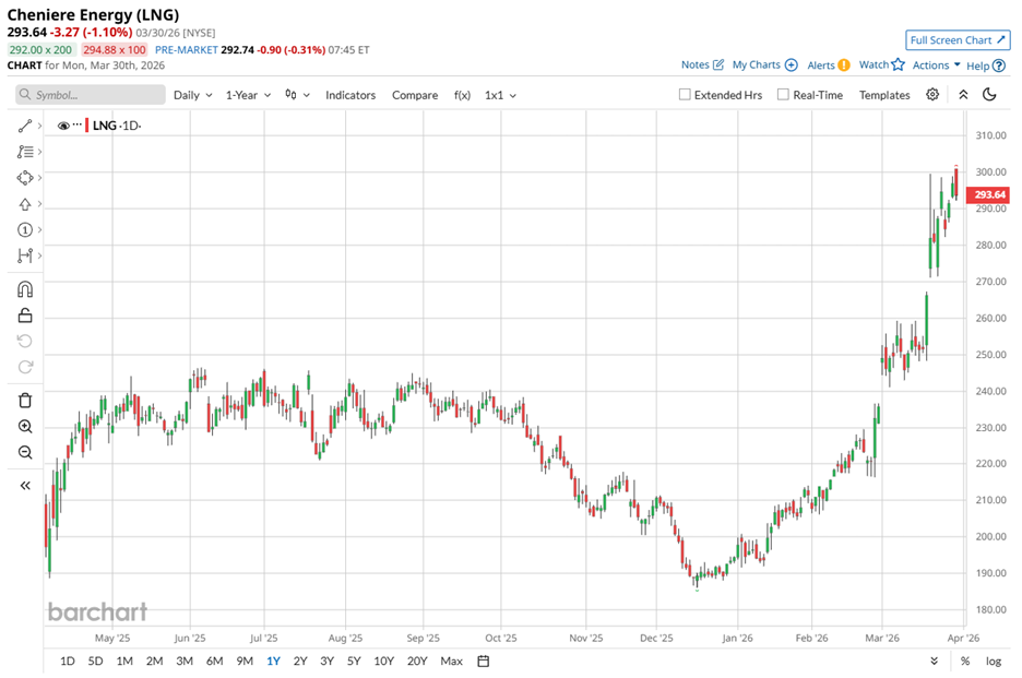 In that environment, Cheniere Energy (LNG) emerges as one of the most compelling ways to play the trend. The stock has already pushed toward $300, reflecting growing investor conviction. With more than 95% of its capacity tied to long-term contracts, the company would secure stable cash flows while preserving upside through uncontracted volumes that can benefit from tighter pricing.