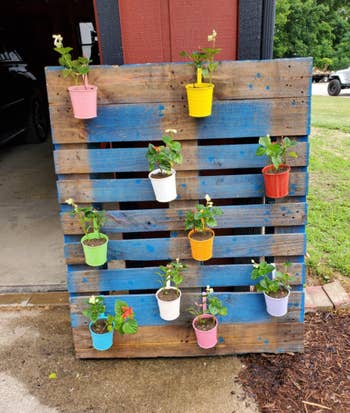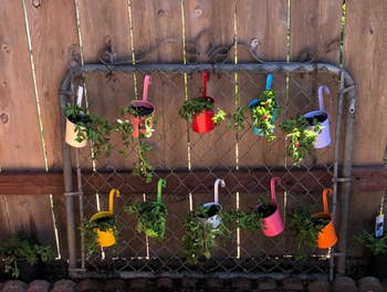 Promising review: "Lovely colorful flower pots. Perfect size to hold a single flower and they add such a nice pop of color to my yard. Very easy to hang up, no hardware required! I’m getting a lot of compliments on them. I bought several sets and planted bright flowers in them. I have them lining the inside of my yard and on the front of the house. They add a lot a cheer and homeyness for a simple and cheap project." —Maegan
