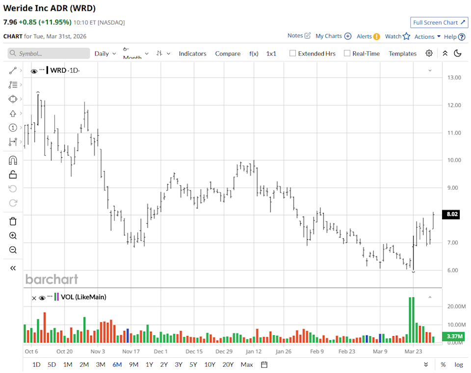 On March 30, Uber Technologies (UBER) disclosed that it owned a 5.82% passive shareholding in WeRide (WRD), representing 56,618,266 shares in the company. WeRide stock went up about 7% on the news, indicating strong investor interest. However, this stake won’t come as a surprise to those who have been following the close relationship between the two countries. UBER and WRD first started collaborating in September 2024. Back then, it was meant to be a strategic partnership to integrate WeRide’s autonomous vehicles onto Uber’s app. It was supposed to be carried out in the UAE first. By May 2025, Uber had decided to broaden this partnership and invested $100 million of its own money to expand the project to 15 cities over a period of 5 years. Stock Index Futures Rally on Prospect of End to Middle East Conflict, U.S. Economic Data and Fed Speak in Focus Ignore the Panic and Buy the Dip in Micron Stock, Says Bank of America Stocks Climb on Hopes for an End to Iran War Markets move fast. Keep up by reading our FREE midday Barchart Brief newsletter for exclusive charts, analysis, and headlines. By obtaining a 5.82% stake in the company, Uber has now deepened its relationship with the autonomous vehicle technology company. If an investor has followed the two companies’ journey together, they will know it only has positive implications for WeRide’s prospects, making the stock a buy. WeRide is an operator of self-driving technologies to provide transportation services. It has a license to operate in 40 cities across 12 different countries. Its products include Robotaxi, Robobus, Robosweeper, and advanced driver-assistance systems (ADAS). The company was founded in 2017 and is headquartered in Guangdong, China. WeRide is down 44.5% in the last 12 months. An extremely poor performance, especially when Uber has traded relatively flat during this period. What’s worse is that the Global X Autonomous & Electric Vehicles ETF (DRIV) has returned 42.6% in the same period. While this is disappointing to say the least, it does make the above news all the more exciting. If Uber is buying the company while it's cheap, why aren’t you? One look at the consensus EPS growth rate gives a good idea of why the stock has struggled over the past year. Its earnings growth is negative at -215% for 2026. One would run away from any company that was tripling its losses in a single year. Yet Uber has done the exact opposite, and the earnings growth after 2026 contains the hint. WRD’s earnings are set to go up by 40% in 2027 and 50% in 2028. This is an inflection point for a company involved in revolutionary technologies. What’s more, the firm has a cash position of just over a billion dollars, with minimal debt. WeRide is as attractive right now as an autonomous vehicles technology stock can be. It offers a great entry point at a time when earnings are down, and the people who know the industry are buying. WeRide announced its Q4 2025 earnings report on March 23, but there was a lot more to look forward to than just the sales and profit numbers. WRD reported a fleet size of more than 850 Robotaxis in China, now covering more than 1000 square kilometers. The utilization rates (daily orders per Robotaxi) now stand at a 6-month average of 15. And 1 in 40 Robotaxis now require remote assistance, a significant improvement from 1 in 10 a year ago. This shows that the technology is improving, further solidifying the potential for unit economics to show its magic when the company scales. There was also 900% year-over-year (YOY) growth in registered users in Q4 2025. Management also pointed out the growth in the overseas business. Q4 2025 saw a 140% YOY growth in international revenue, now accounting for 31% of the total revenue. This is important because the overseas market allows WeRide better profitability, as per the management. In fact, the company’s Middle East subsidiary is already profitable on a standalone basis. So a partnership with Uber becomes even more significant in this backdrop. In early February, Macquarie initiated coverage of WeRide stock, assigning an “Outperform” rating and a $17.5 price target. The analyst points out that WeRide is different from other ride-hailing companies because it leverages collaboration with other companies (like Uber) for growth. The analyst’s price target suggests an 85% upside for investors buying at the current share price. Of the eight analysts that currently cover the stock on Wall Street, seven have a “Strong Buy” rating, and one has a “Moderate Buy,” with a mean price target of $14.97. On the date of publication, Jabran Kundi did not have (either directly or indirectly) positions in any of the securities mentioned in this article. All information and data in this article is solely for informational purposes. This article was originally published on Barchart.com