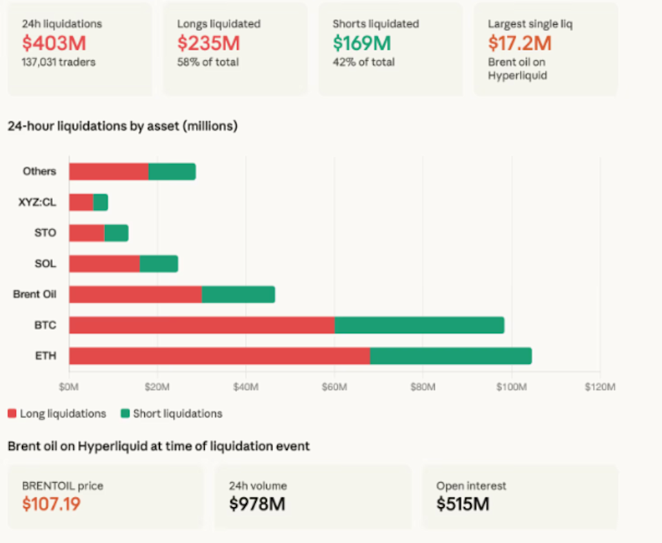 An oil trader lost more than $17 million after U.S. President Donald Trump didn't indicate any path to de-escalate the war in his primetime speech on Apr. 1. Instead, the president threatened to hit Iran "extremely hard" over the next 2-3 weeks and bring the country back to the Stone Age. He also threatened strikes on Iran's power plants if there is no deal within the next few weeks. Related: Mysterious trader buys $53 million ahead of Trump's 9 PM Iran address, key takeaways When Trump didn't lay out a de-escalation plan as expected, the markets tanked and trading activity hiked sharply on the decentralized crypto trading exchange, Hyperliquid. After Ethereum (ETH) saw $104.5 million in liquidations and Bitcoin (BTC) $98.3 million, tokenized Brent crude oil futures ranked third with $46.6 million over the past 24 hours on the exchange. The contract is a perpetual product linked to the price of a barrel of Brent crude oil. A Brent oil position worth $17.2 million was the largest liquidation across all assets on Hyperliquid. Ripple CEO predicts new timeline for historic crypto legislation Google warns quantum attack could crack Bitcoin in 9 minutes Warren Buffett offers $350B rescue plan amid market uncertainty Hyperliquid has witnessed a sharp surge in oil trading during the Iran war. Built mainly for perpetual futures trading, the exchange lets users trade asset derivatives with high leverage. After Bitcoin ($2.78 billion) and Ether ($1.49 billion), the WTI crude oil contract ($934.89 million) and the Brent oil contract ($733.64 million) were the most-traded assets over the last 24 hours on Hyperliquid. The WTI crude oil contract has surged 10% over the last 24 hours, trading at $109.83 a barrel. The Brent crude oil contract has surged more than 6.5% to trade at $108.85 a barrel. HYPE, the native token of Hyperliquid, also rose around 7% over the last 24 hours to trade at $34.71 at the time of writing. Related: Oil becomes second-most traded asset on popular crypto exchange This story was originally published by TheStreet on Apr 2, 2026, where it first appeared in the MARKETS section. Add TheStreet as a Preferred Source by clicking here.