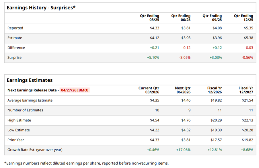 Domino's Pizza, Inc. (DPZ), headquartered in Ann Arbor, Michigan, operates as a pizza company. With a market cap of $12.1 billion, the company operates a network of company-owned and franchise Domino's Pizza stores, located worldwide. DPZ also operates regional dough manufacturing and distribution centers. The multinational pizza restaurant chain is expected to announce its fiscal first-quarter earnings for 2026 before the market opens on Monday, Apr. 27.