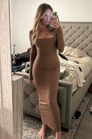 Promising reviews: "I saw this girl wearing this exact style of dress with a Skims tag on the back, and honestly, it made me so grateful that I purchased this dress instead. It looks exactly like the Skims version, and I could be biased, but the material of this dress looked better than the Skims one. If you want it to be a little snug, I would definitely recommend sizing down one size from your normal size. So freaking comfortable and made out of thick material." —Kaitlyn
