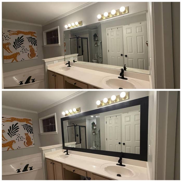 Promising review: "Where do I start? I absolutely LOVE this product. I wanted to replace our bathroom mirror, but due to the size, it would have cost a lot! I came across this on Amazon and decided to give it a try. The application process was super easy and applied without bubbles as long as you go slow and rub it down as you go. I kid you not. It looks like wood and feels like it, too! You can feel and see the 'wood grain.' It’s absolutely stunning and looks like I bought a whole new mirror." —Taylor