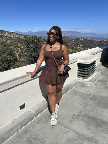 Promising review: "This dress was cute and fit perfectly! I like the pocket in the shorts underneath. The dress I have from Fabletics is similar but costs more, and they don’t have brown, so this really was a good buy." —Erin C
