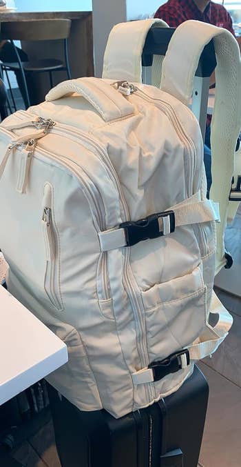 "I have sent the link for this bag to so many loved ones because it has changed the way I’ve traveled. I have always been the overpacker, having to pay excess weight fees on my luggage. Since using this bag, I have been able to cut down to a carry-on and personal item on most trips. Come the end of this year, my husband and I will have been on eight trips. This bag has been with us for half of them. I use it as my personal item and easily pack shoes, a large cosmetic bag, hair tools, clothes, a steamer, snacks, chargers, and other small items — it holds so much. The cream color is very stylish, and it is easy to clean. I cannot explain enough how much I love it. I’ll be ordering my husband one in another color for our longer trips." —Mads