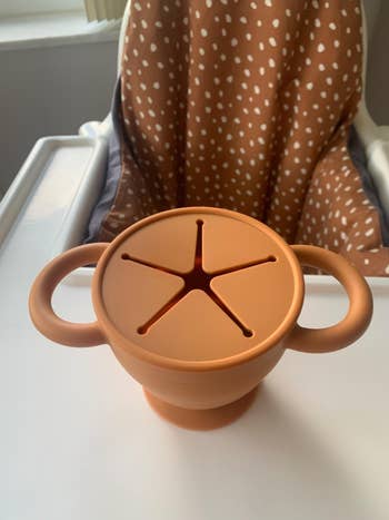 Promising review: "This travel product is the absolute best for toddlers. Love that it sticks to large hardcover books, airplane trays, stroller trays, and nearly all hard surfaces. Collapsing when not in use saves cupboard space and backpack space! Fairly easy to clean. My toddlers can eat their snack without losing half of it on the floor, suction the cup to a tray and put the cover on unassisted. Great travel cup for kids." —Jennifer