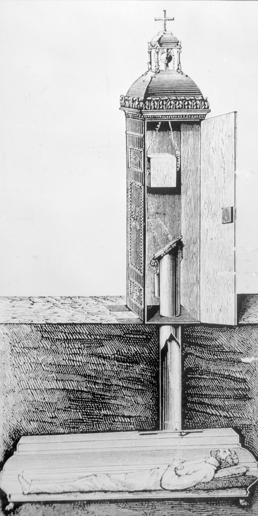 Built into the tombstone is an airshaft leading down to the "safety coffin." An electric wire is attached to the hands of the dead, and the slightest movement would trigger an alarm bell and open the lid of the airshaft.