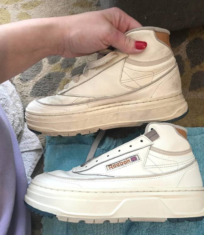 Promising review: "Literal magic in a bottle!!! A must-have for pristine sneakers! It took just a couple of minutes per shoe to get them white again. The cleaner effectively removes dirt and stains, restoring my sneakers to their original glory. It's especially impressive on white shoes, leaving them looking fresh and new. The cleaner is also gentle, ensuring it doesn't damage the delicate materials like suede and nubuck. The brush is sturdy yet gentle enough to use on different fabrics without causing any damage. The combination of the cleaner and the brush makes the cleaning process quick and efficient." —brad1856