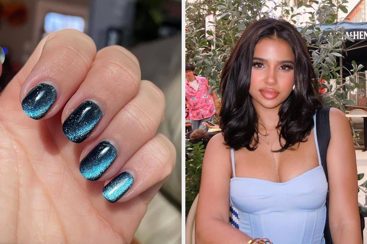 Promising review: "I've been doing my nails for years, and this was so fast and fun to use. I always wanted cat eye polishes in my collection and this was perfect! Especially for Christmas time! I will say they are thick, and I'm guessing that's because they're pigmented and packed with the little magnetic bits for maximum shine and glimmer. I feel like I have the northern lights on my nails! I would recommend playing on a few test nails beforehand to get a handle on the different patterns you can make with the magnet. Overall, would recommend it for anyone wanting something easy and fun!" —Hailey