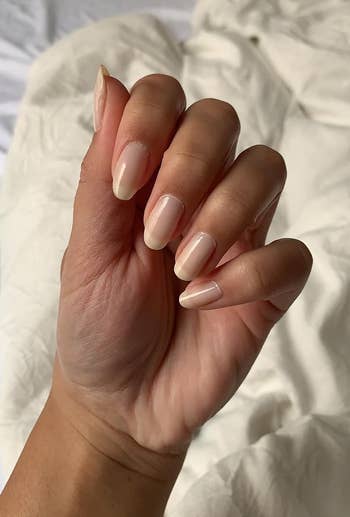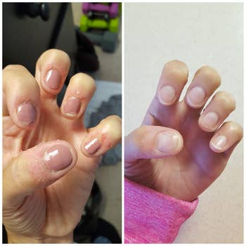 Promising review: "This product is witchcraft. My nails have always been brittle, flaky, and super prone to just breaking. Because of all that, I had the nasty habit of biting them. I didn’t take one before or after, but the image with no polish is just three days of use. My nails have been growing like [wild] since then and are stronger than ever in my life. The image with polish is about a month of use (once a day). Also, it helped me to stop biting my nails. I can now do my own nails and shape them the way I want. Never in my life did I think I’d have nails I could shape myself. I don’t leave a lot of reviews, but trust me when I say this product is worth the hype. I’m definitely a returning customer." —Andrea