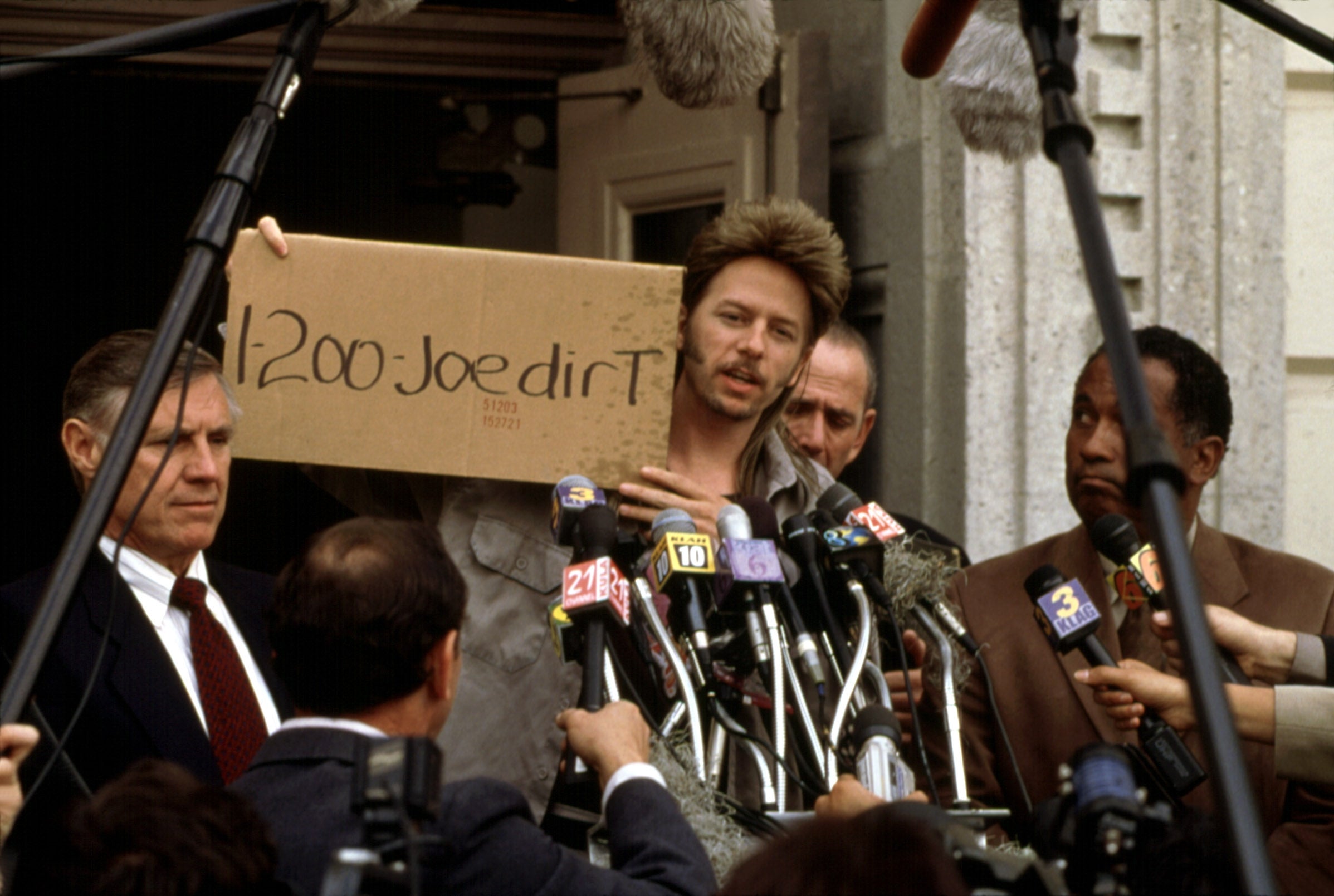 Logline: "He's the wrong person, at the wrong place, at the wrong time. Joe Dirt (David Spade) is a janitor with a mullet hairdo, acid-washed jeans, and a dream -- to find the parents that he lost at the Grand Canyon when he was eight. As his wandering, misguided search takes him from one misadventure to another, he finds his way to Los Angeles, where a shock-jock (Dennis Miller) brings Joe on the radio to insult him. But as Joe's story unfolds, jeers turn to cheers, and an entire city is captivated."