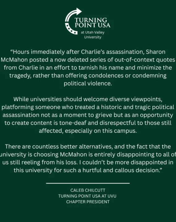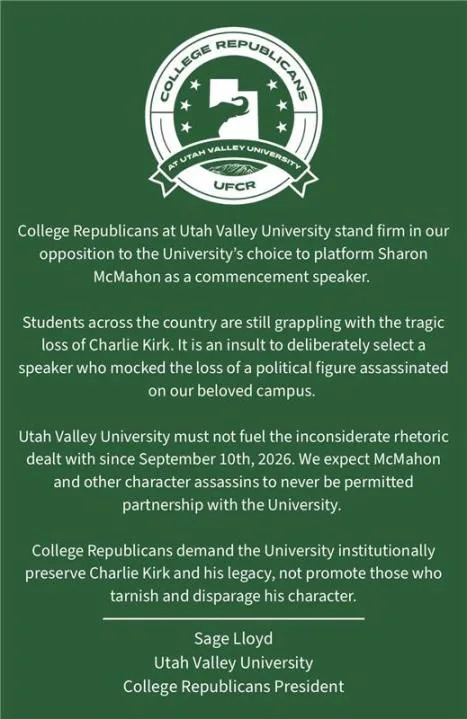 PROVO, Utah (ABC4) — Opposition has grown at Utah Valley University in the days since the school announced the chosen commencement speaker for the class of 2026. Utah Valley University (UVU) announced New York Times bestselling author, Sharon McMahon, as the 2026 commencement speaker. She has been selected as the keynote speaker for the annual commencement ceremony and is also set to receive an honorary Doctor of Education degree. “Sharon McMahon is an original. She is a force of nature and a force for good… Sharon’s work reminds us of the power we each hold, and that every individual is mighty in some way,” UVU President Astrid S. Tuminez said in a statement. McMahon is widely known for her newsletter and podcast titled “The Preamble,” which shares “fact-based,” nonpartisan insights on history, government, and current events. ‘The eagle has landed:’ Utahns react after historic Artemis II splashdown The university’s announcement was met with strong opposition from UVU students, all who drew attention to a set of posts made by McMahon in the days after the assassination of prominent republican political activist Charlie Kirk. Students allege that some of the threads have been taken down, however, one of the thread responses was a series of Charlie Kirk quotes and is still up on McMahon’s account. She framed the post as an explanation for “why there is so much backlash to posts eulogizing his death.” The posts list quotes that Kirk allegedly said followed by McMahon’s interpretation of the quotes. “These aren’t sound bites taken out of context. Millions of people feel they were harmed, and the murder that was horrific and should never have happened does not magically erase what was said or done,” McMahon’s post reads. Caleb Chilcutt, President of Turning Point USA at UVU, issued a statement opposing the university’s decision. How to make ABC4 your preferred news source on Google The UVU College Republicans issued a similar statement, also speaking out in opposition of McMahon’s presence on campus. ABC4 has reached out to McMahon for a comment but has not heard back. Route 66 turns 100: A glimpse at some of the sights, eats and attractions in all 8 states Thunderstorms, gusty winds this weekend, cooldown on the way 90th Masters Tournament | Saturday updates Democratic leaders navigate minefield amid liberal clamor to remove Trump Utah Grizzlies’ final homestand marks end of an era Copyright 2026 Nexstar Media, Inc. All rights reserved. This material may not be published, broadcast, rewritten, or redistributed. For the latest news, weather, sports, and streaming video, head to ABC4 Utah.