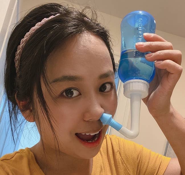 Not only do you get the bottle but also three nozzles (two for adults and one for kids) and a 30-pack of nasal wash salt packs. Read more about nasal rinses and allergies at Mayo Clinic — including important info on using distilled or sterilized water.