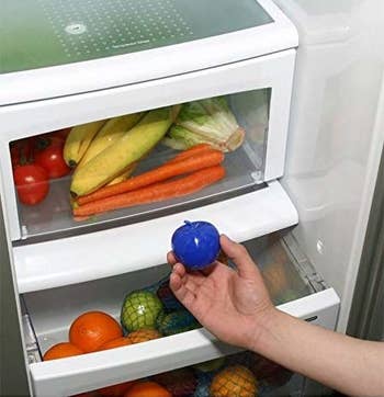 Promising review: "I love awesome little items like the Bluapple that serve a useful purpose and make life a little easier. I put a Bluapple in each of my bottom fridge drawers where I keep my fruits and veggies, and I have definitely noticed a difference. My fruits and veggies remain fresh and last longer before going bad. This saves me money, and although I compost any fruits or veggies that go bad, I prefer not to let perfectly good fruit spoil before we have a chance to eat it. I am going to buy more to place throughout the fridge since we are buying and eating more fruits and veggies this summer. I also appreciate how the contents inside can be fed to a houseplant as fertilizer every three months when adding a fresh refill." —Mariposa