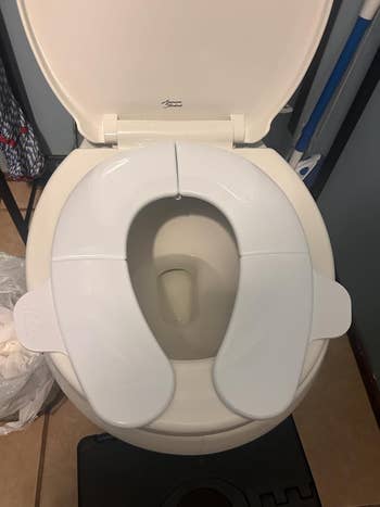 Promising review: "We love this portable potty seat! We started potty training my daughter right after she turned 2 years old, and took this seat everywhere! We love the quality of the seat and how durable it is. It easily folds up, has little handles (making it easy to lift off the toilet), and comes with a bag to put it in! It’s also really easy to clean. Great size for my 2-year-old, but I can tell it will work great as she continues to get older and bigger." —Dave