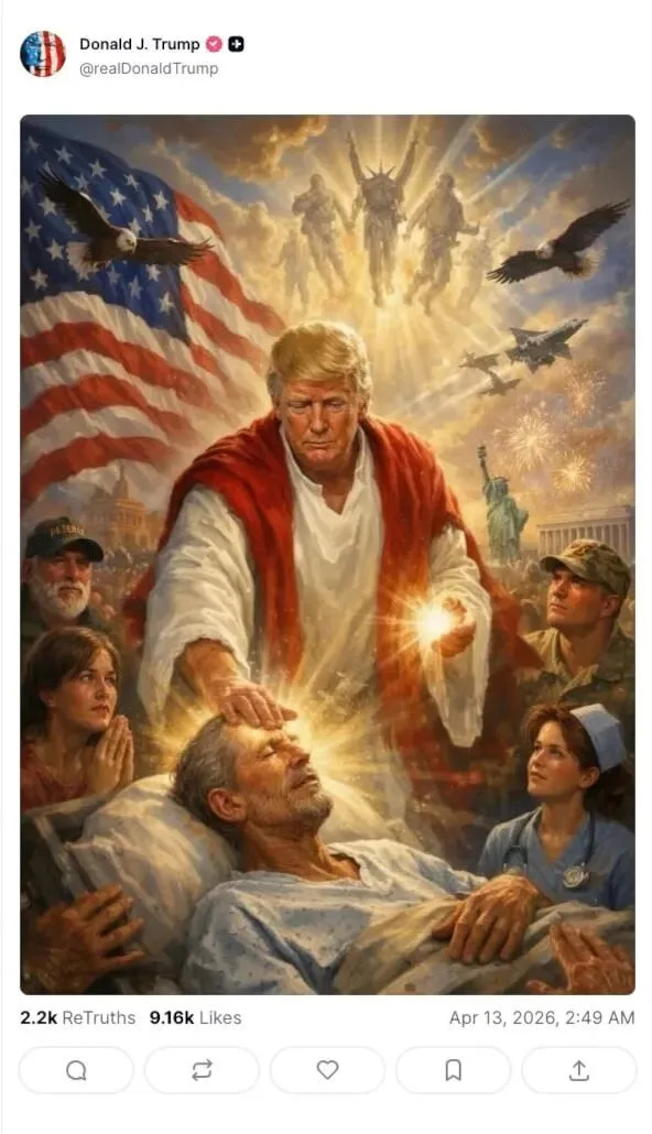 The image, posted to Truth Social late Sunday night, portrays Trump as Christ, laying his hand on a patient in a hospital bed as if healing him. He is surrounded by other figures, including a nurse, a soldier, and a praying woman. Also visible are the U.S. flag, several bald eagles, the Statue of Liberty, and the Lincoln Memorial.