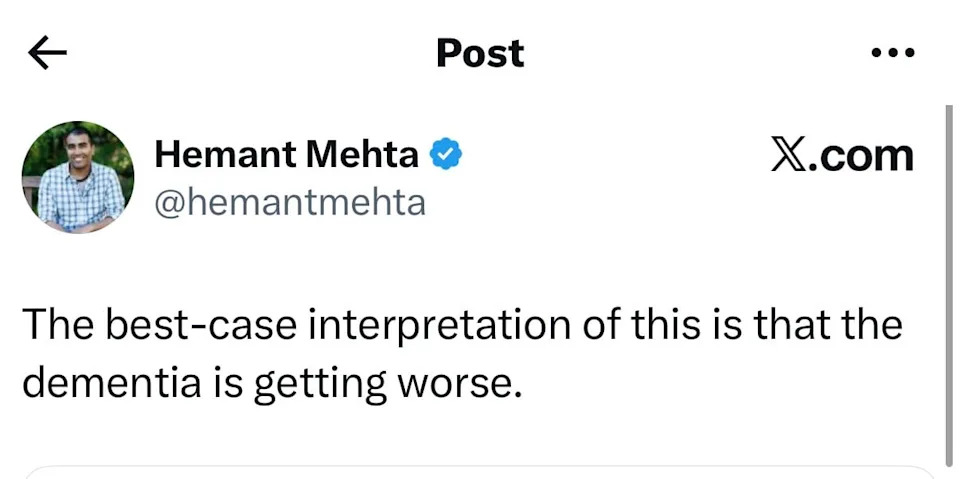 “The best-case interpretation of this is that the dementia is getting worse,” Hemant Mehta, a political commentator, shared with his over 100,000 X followers.
