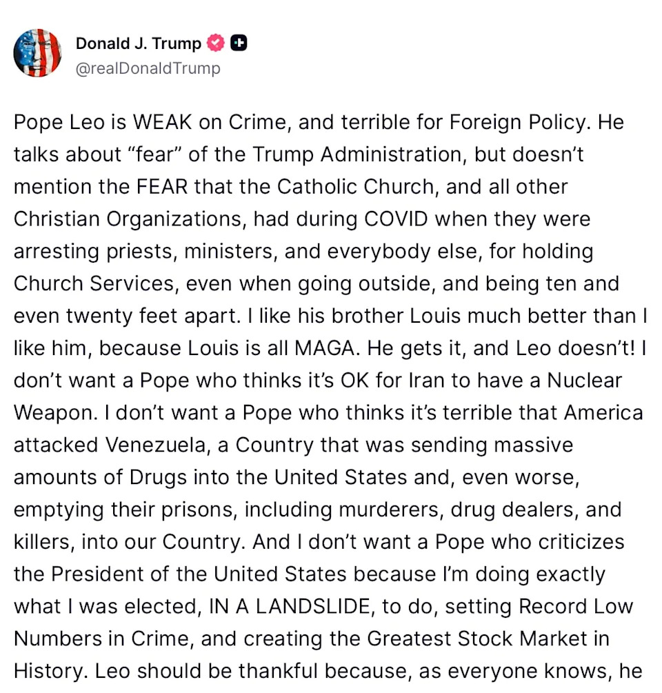When asked about Trump’s Truth Social website itself, the pope offered his own wry remark. “It’s ironic—the name of the site itself. Say no more,” he added.