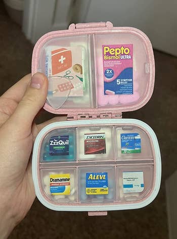 Promising review: "Flight attendant–approved! These pill containers are simply amazing! The latch and seal on them is very secure due to its rubber gasket around the inside. I put my daily medications in each of the six smaller compartments on one side and then use the larger two containers for vitamins and supplements. I keep this in my tote bag for work and I am not concerned at all about it opening. I can’t tell you how many times some of the other pill boxes I used have opened up, tossing prescription medications into the smallest corners of my bag. Well-designed and well-executed!" —Christina S.