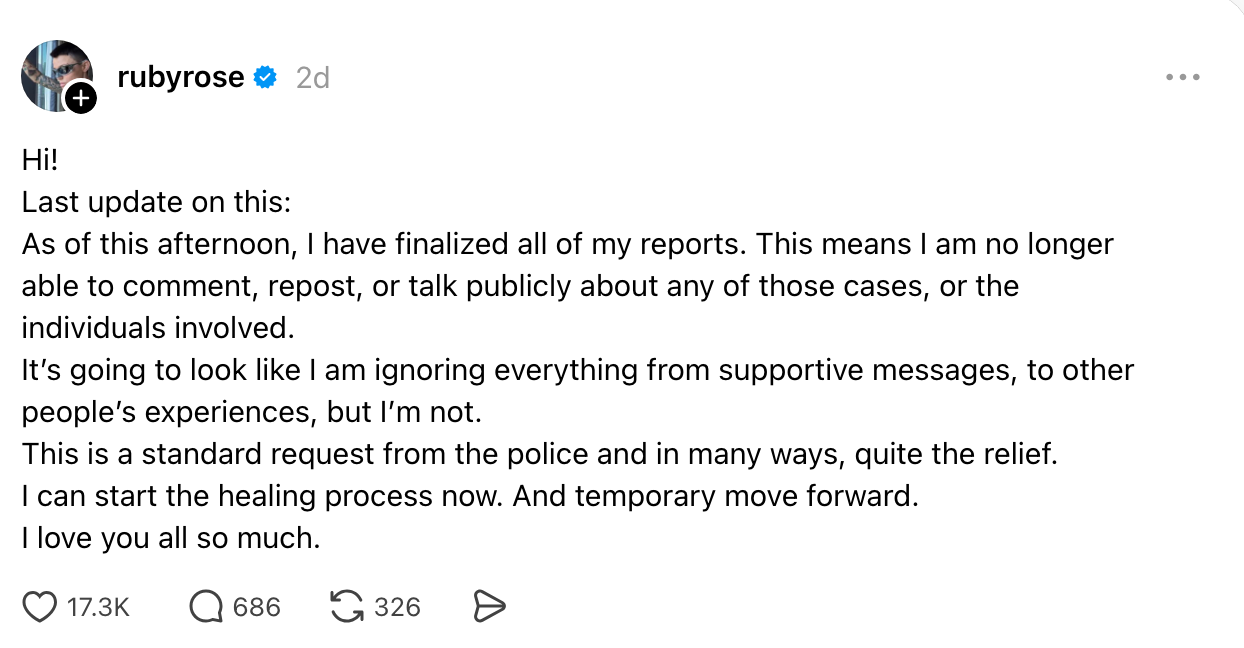 It comes after Katy’s representative vehemently denied Ruby’s claims, accusing her of spreading “reckless lies.” As a Celebrity Reporter, I cover everything from fashion and award shows to TV, film, and cultural conversations. This post discusses allegations of sexual assault. “I was only in my early 20s. I’m now 40. It has taken almost 2 decades to say this publicly. Though I am so grateful to have made it long enough to find my voice, it just shows how much of an impact trauma and sexual assault takes. Thank you for seeing me,” she wrote in a separate post. “Ms. Rose has a well-documented history of making serious public allegations on social media against various individuals, claims that have repeatedly been denied by those named,” they added. “This is a standard request from the police and in many ways, quite the relief. I can start the healing process now. And temporary move forward. I love you all so much,” she said. If you or someone you know has experienced sexual assault, you can call the National Sexual Assault Hotline at 1-800-656-HOPE (4673), which routes the caller to their nearest sexual assault service provider. You can also search for your local center here.