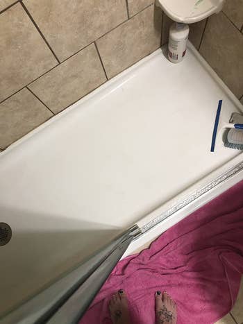 Former BuzzFeed Shopping writer Britt Ross tried The Pink Stuff and says: "Upon moving to a new house, I discovered I'd inherited some not-so-well-maintained white bathroom tile, with white grout to match. At least, the grout had been white at one point. Woof. After having heard nothing but raves about The Pink Stuff, I decided to see how well it would work on what has probably been my most trying cleaning task to date. Well, I'm happy to report that after a bit of light scrubbing, The Pink Stuff was able to lift most of the muck off of the grout, revealing a much lighter surface underneath (GIF for proof!). While I think it might take a few more applications for the grout to *dazzle,* I'm super impressed by the difference I was able to see right away, and with not very much elbow grease to boot. I mean, it is white grout, so if it was able to work wonders on that, I can't wait to see what it does for my crusty pots and pans!"